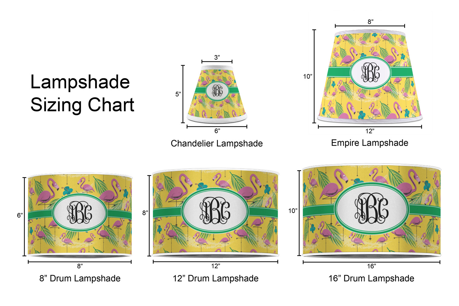 Our customized lamp shades also come in 3 different sizes: 8", 12" and 16", measuring at 8" in diameter by 6" tall, 12" in diameter by 8" tall, and 16" in diameter by 10" tall, respectively.