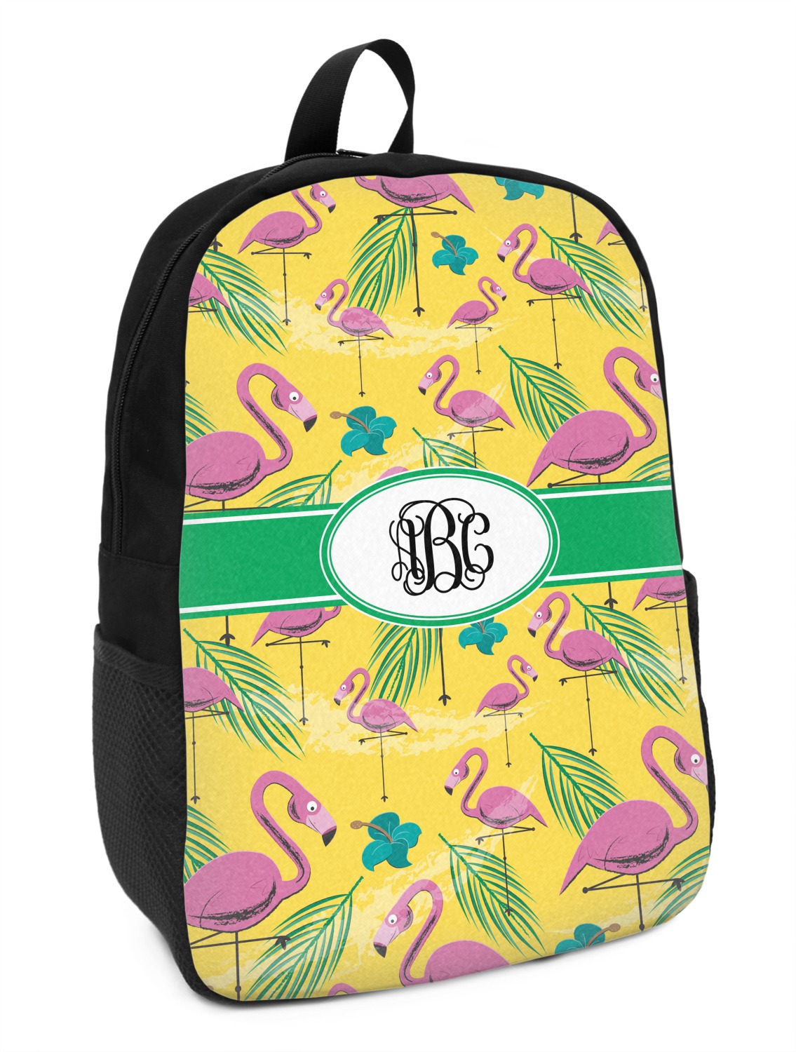 These small backpacks are made of a durable black canvas material with your personalization right on the front. The two shoulder straps are padded and easily adjustable. The bag itself measures at about 11" W x 15" H x 5" D. It's the perfect size for elementary aged kids or adults who want a smaller backpack. On the top of the bag you will find a handle to hang or carry your backpack by as well as a large zipper closure to keep all of your belongings safe inside. On each side of your backpack is a mesh pocket for a small item or water bottle. Inside your backpack you will find a spacious area with a small zipper pocket and a padded laptop slot that will fit up to a 13" laptop (13" being very snug). This is the perfect bag for any student that needs a couple books and their laptop with them at all times. It also works great as a carry on for traveling!