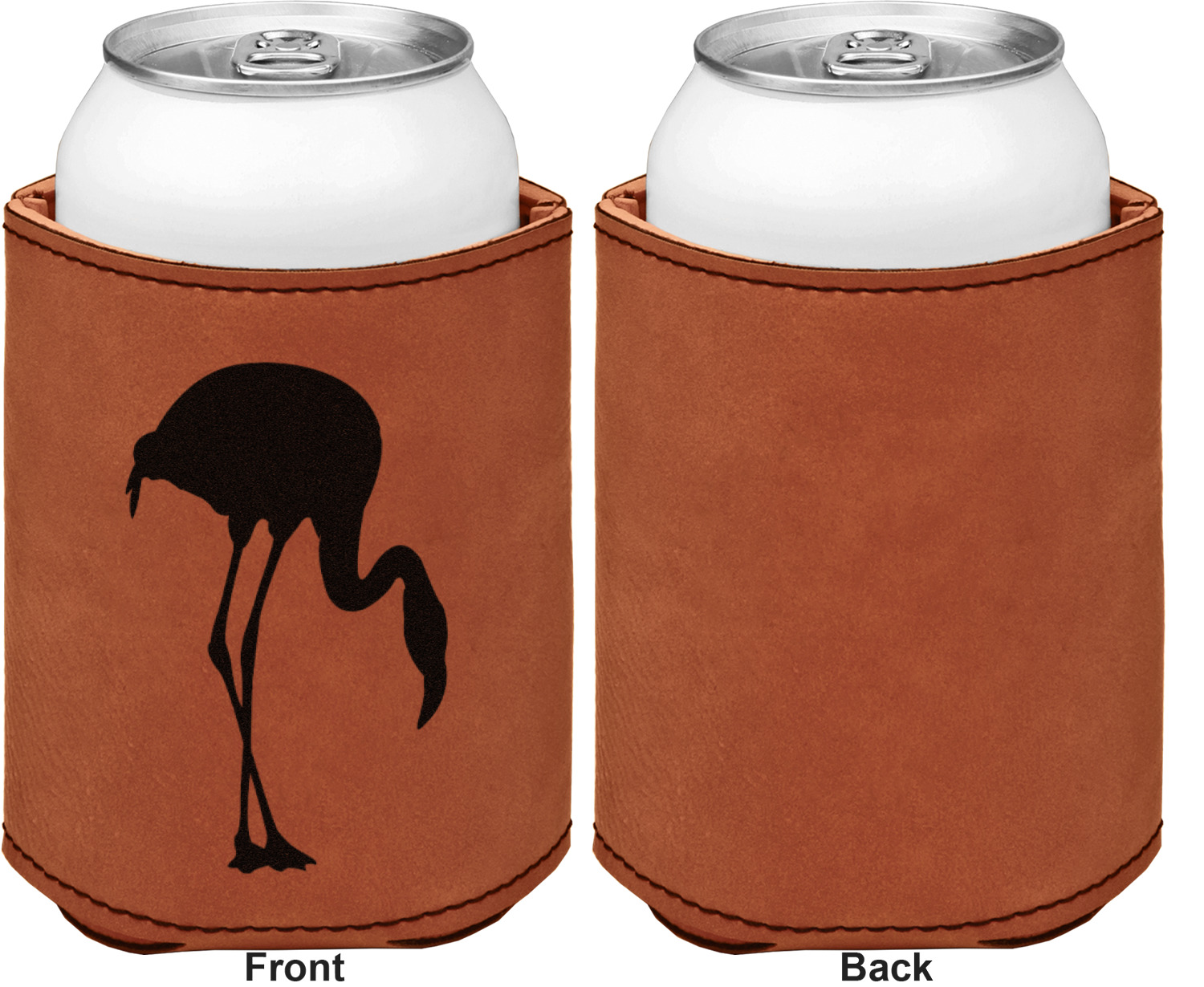 This can sleeve is made from a cognac-brown leatherette and stitched with a sturdy, black thread. A slim padding lines the inside of your can sleeve to allow for a better fit once your drink is inserted. The sleeve itself measures at 4 by 4.5 inches, allowing this custom can sleeve to accommodate most canned drinks. Your personalized design can be engraved on the front and back, or solely the front. When laser-engraved, your design appears as a black coloration which contrasts the leatherette nicely.