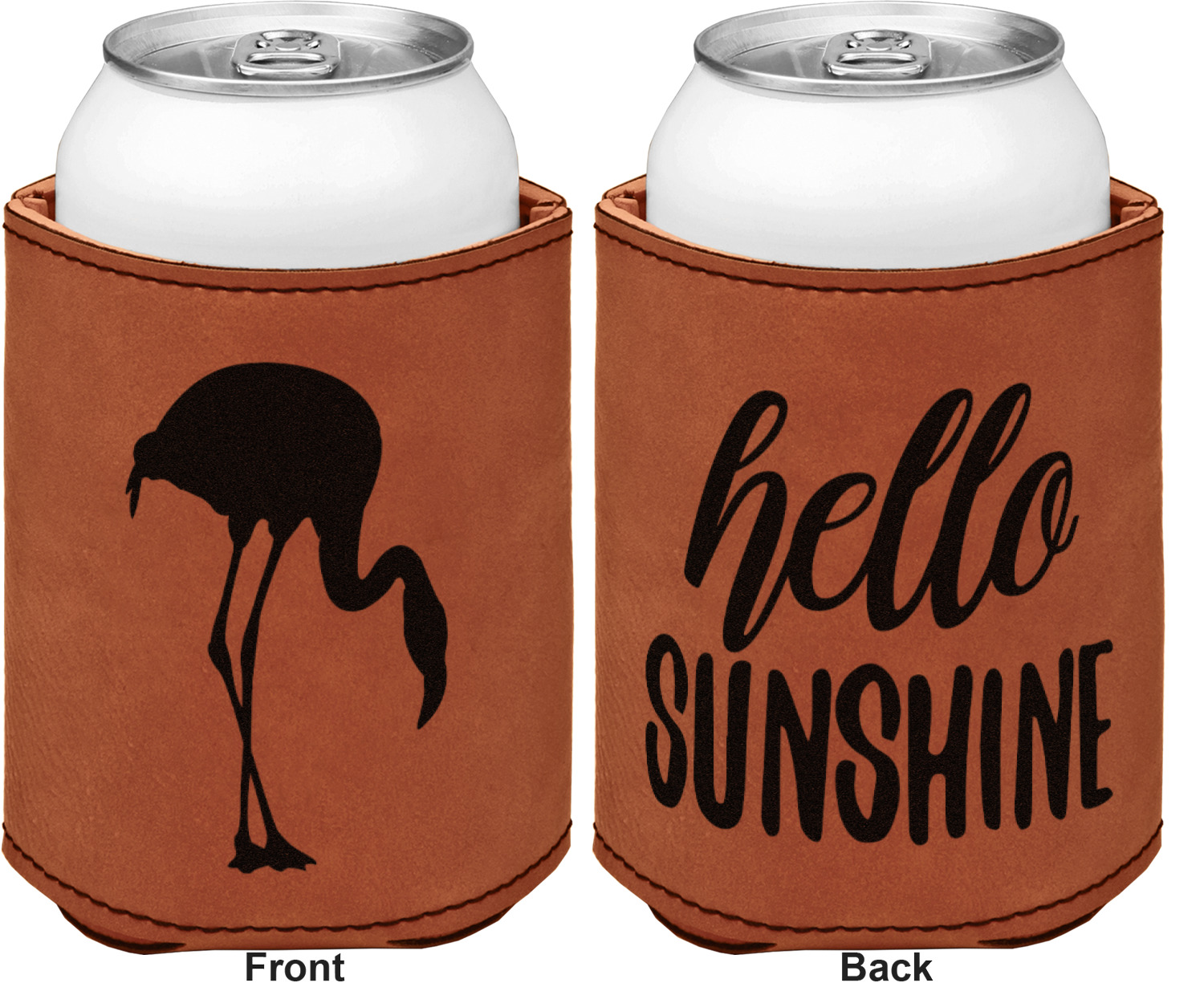 This can sleeve is made from a cognac-brown leatherette and stitched with a sturdy, black thread. A slim padding lines the inside of your can sleeve to allow for a better fit once your drink is inserted. The sleeve itself measures at 4 by 4.5 inches, allowing this custom can sleeve to accommodate most canned drinks. Your personalized design can be engraved on the front and back, or solely the front. When laser-engraved, your design appears as a black coloration which contrasts the leatherette nicely.