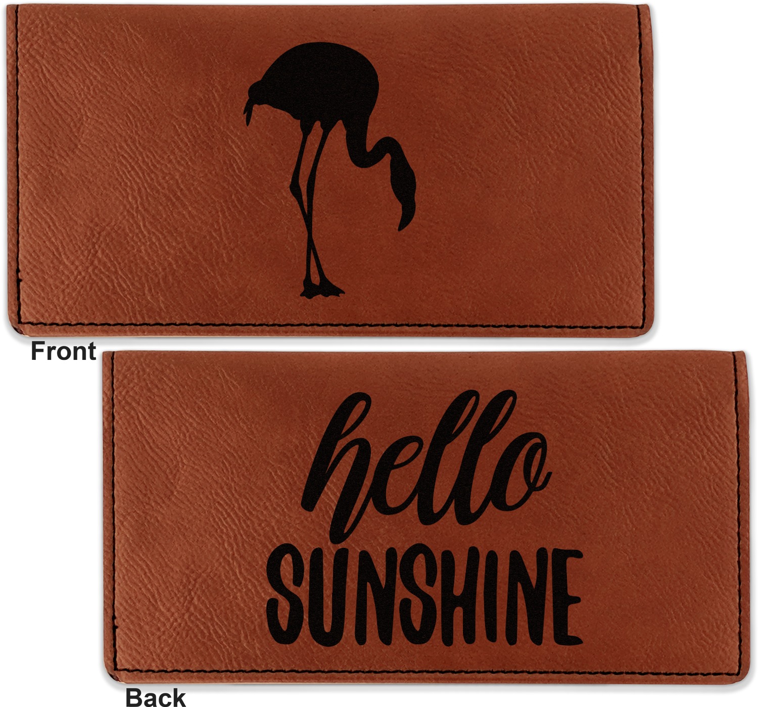 Go into our design center to start personalizing. Your checkbook cover will be laser engraved, making the graphic or text a black color. Choose a fun saying, monogram, or font to go on your checkbook cover. You have the opportunity to do it double or single sided.