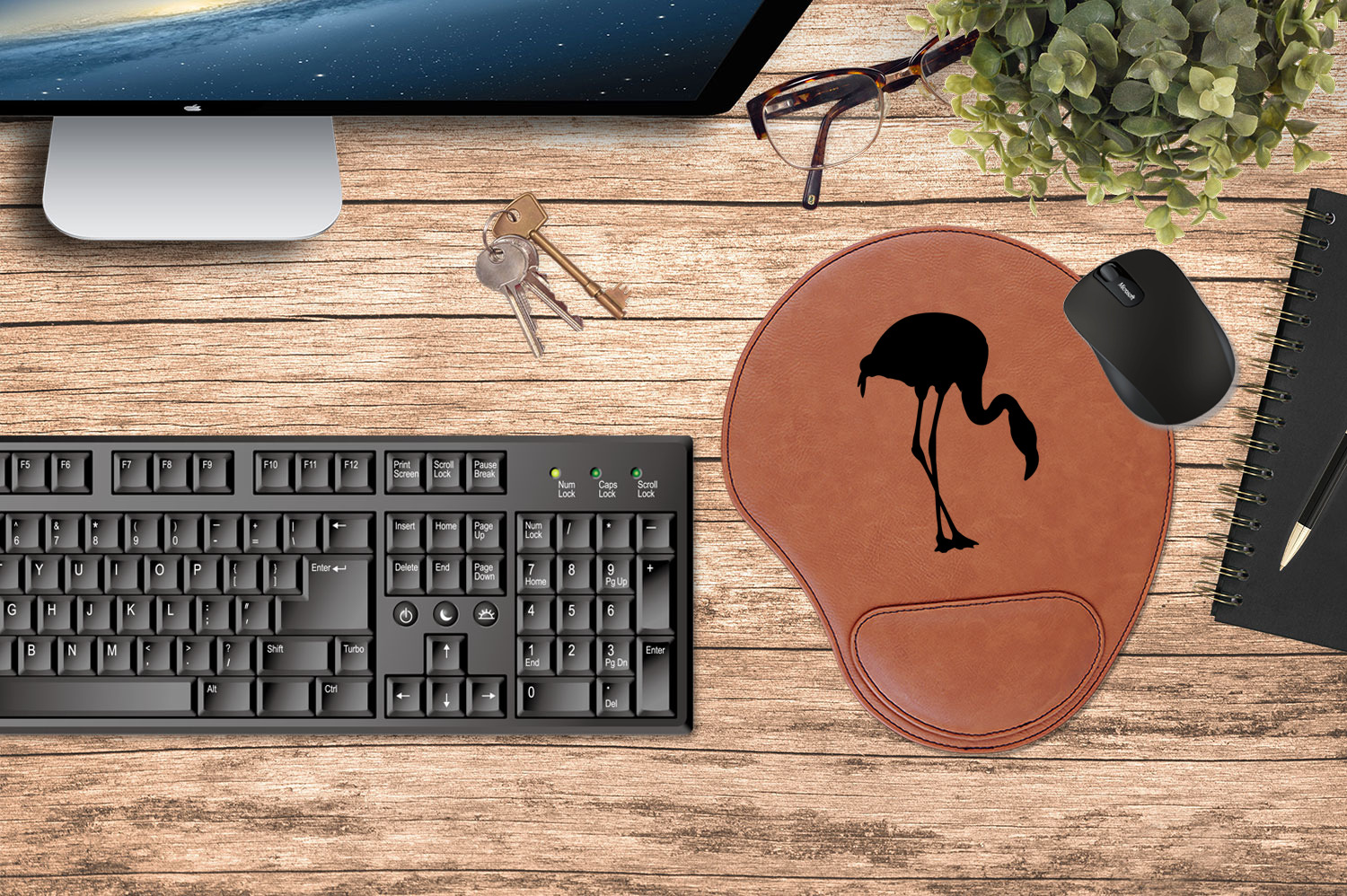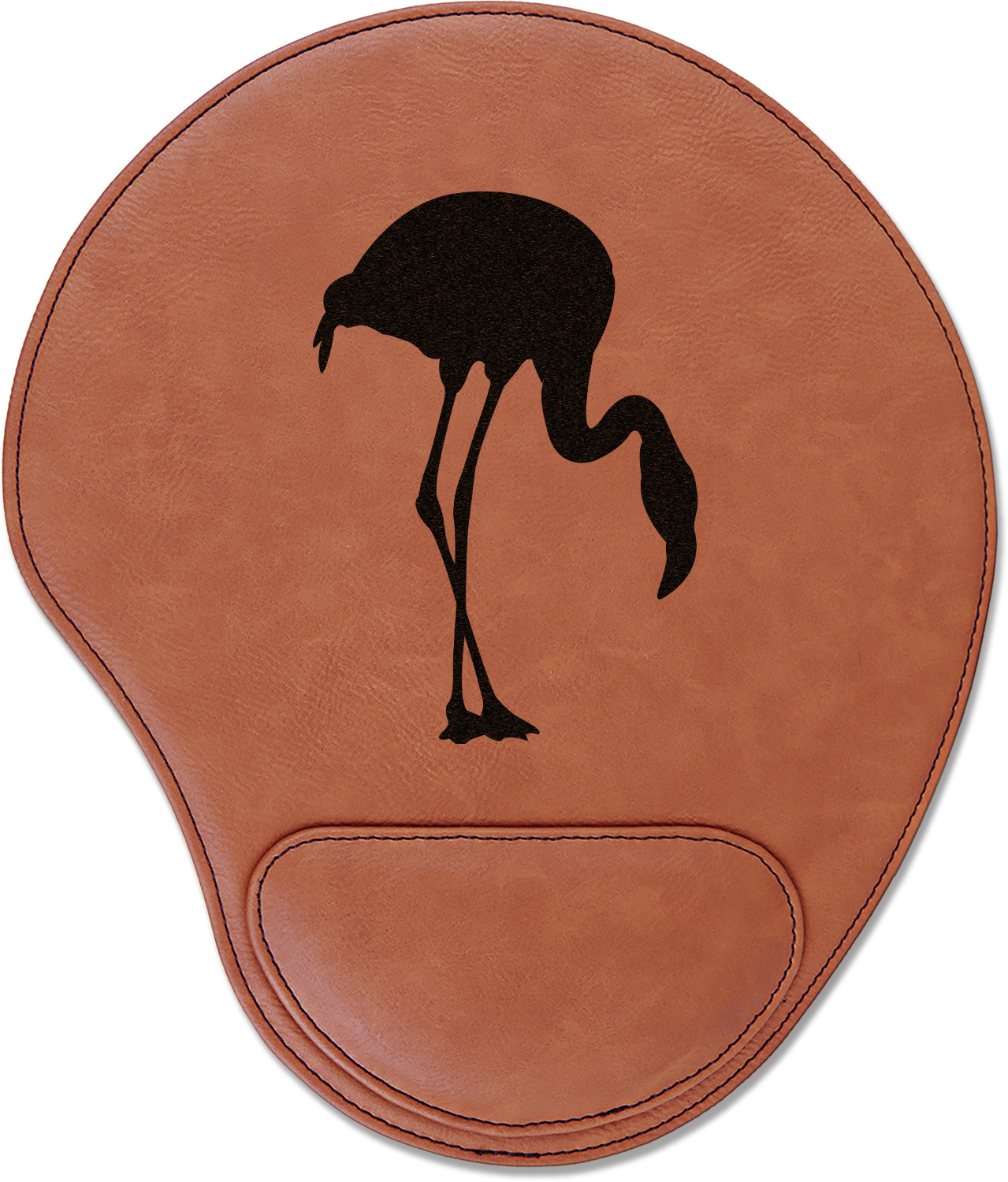 In a rounded shape, this mouse pad is made of a luxurious, cognac-colored leatherette. The nature of this material allows your mouse to glide smoothly across its surface. Strong stitching lines the edges to guarantee stability and strength. As added support for tired wrists, your personalized mouse pad features a supportive wrist rest at its bottom. This model measures at 10.25" x 9", while its wrist pad is approximately 5" x 2.75", with a thickness of 0.75". Your personalized design is laser engraved into the front face of this mouse pad.