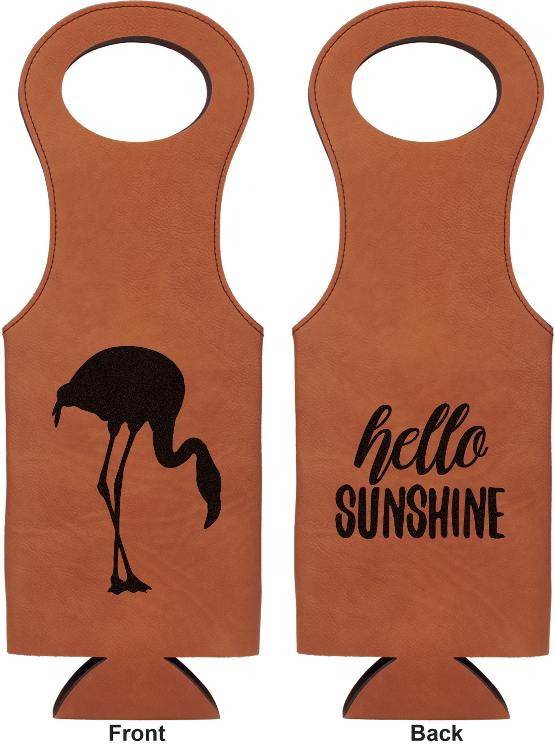 This wine carrier is made from a stunning leatherette, in a cognac-brown color. Strong, black stitching lines the sides of your wine bottle bag and provides extra durability. The interior is lined with a padded, black material to allow for a snug fit once your bottle is placed inside. At the top of this wine gift bag, you'll find two oval shaped handles that elegantly complements the rest of the bag's style. We provide you with the option of laser-engraving the front, or the front and back of your new personalized wine bag!