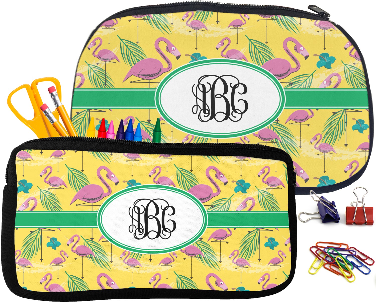 Built from durable neoprene, these pencil pouches, are water resistant, and prevent leaking ink from spilling into your backpack or purse. These custom pencil cases secure with a robust, black zipper. We print your personalized design on the front of this pouch, while the remaining sides a simple black color. These colored pencil cases [880] are sold in two sizes; our smaller version measures at 8.5 by 4.5 inches, while the medium measures at 10.5 by 6.5 inches. The smaller size is more suitable for holding pencils and pens, while our medium size can accommodate pencil sharpeners, scissors, and erasers.