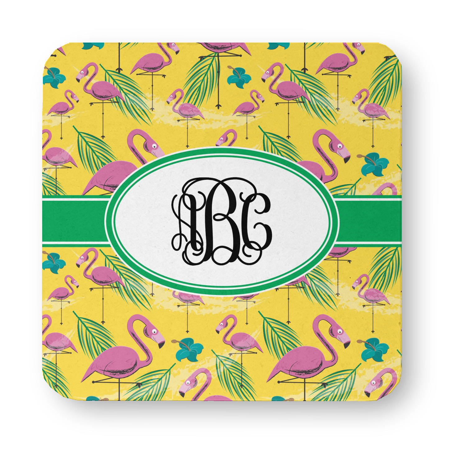 The idyllic tropical vacation includes palm trees, flirty flowers, and flamingos. This design encompasses all these things and more, on a bright yellow background with sand sprawled carefully throughout.