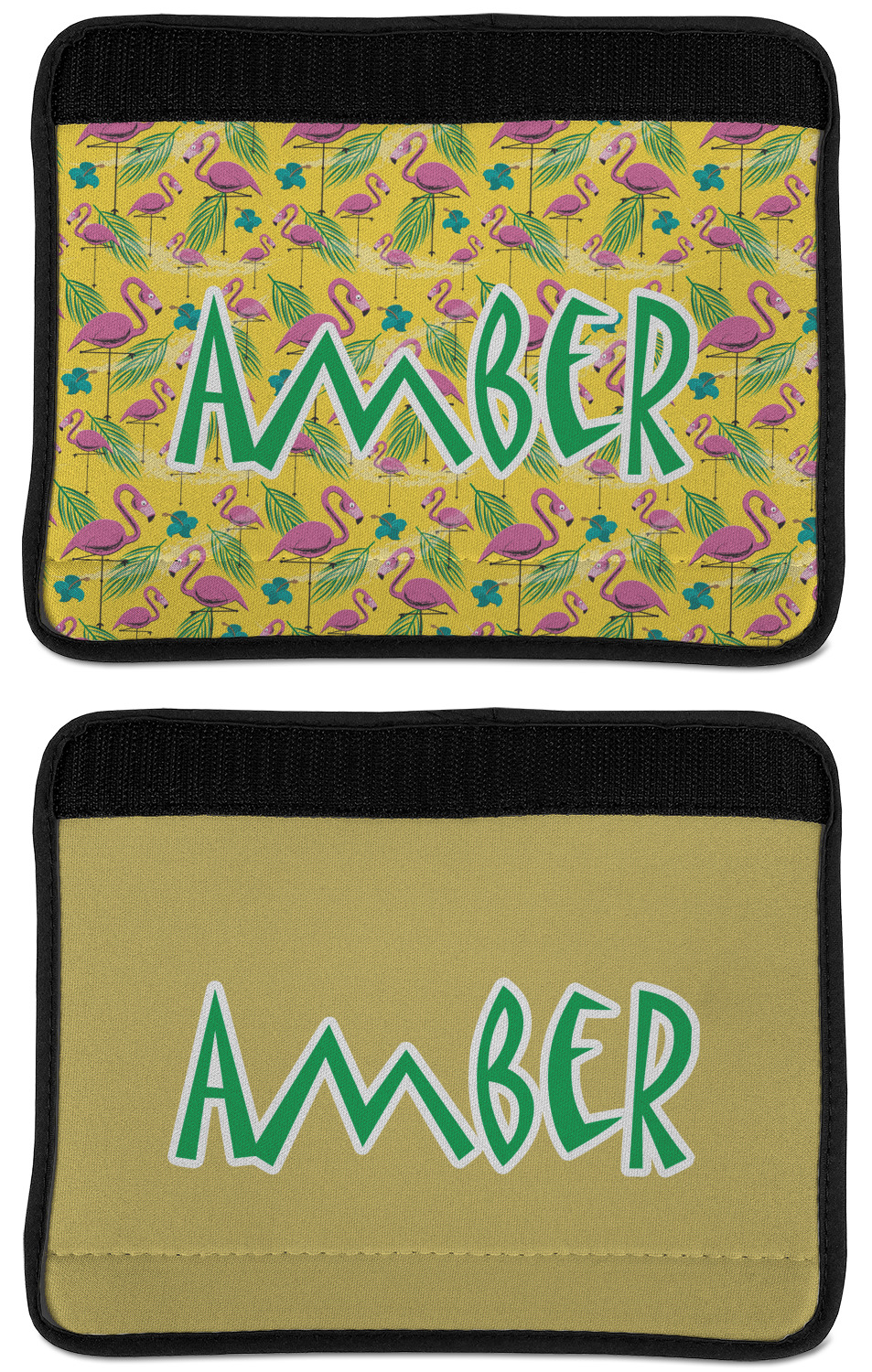 Made from neoprene, our seat belt strap covers wrap around the belt itself and have a Velcro tab for easy attachment and closure. The belt's edges are trimmed with a black polyester for a secure finish. Each cover is 9.5 by 7 inches when open and 9.5 by 2.5 inches when closed. We print your personalized design on the face of the seat belt pad.