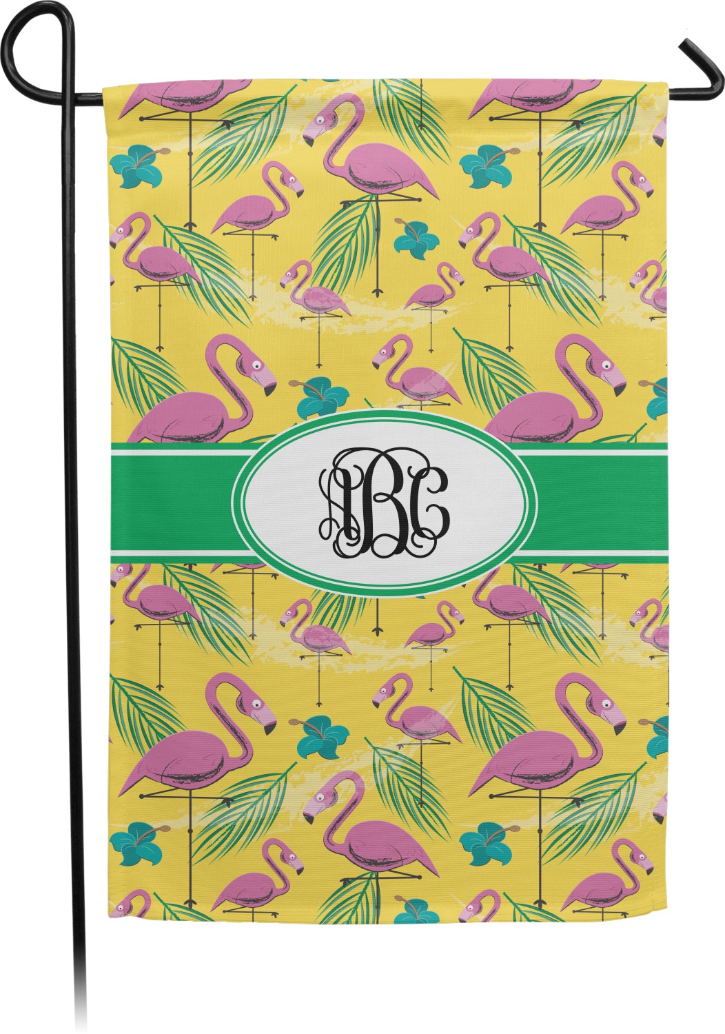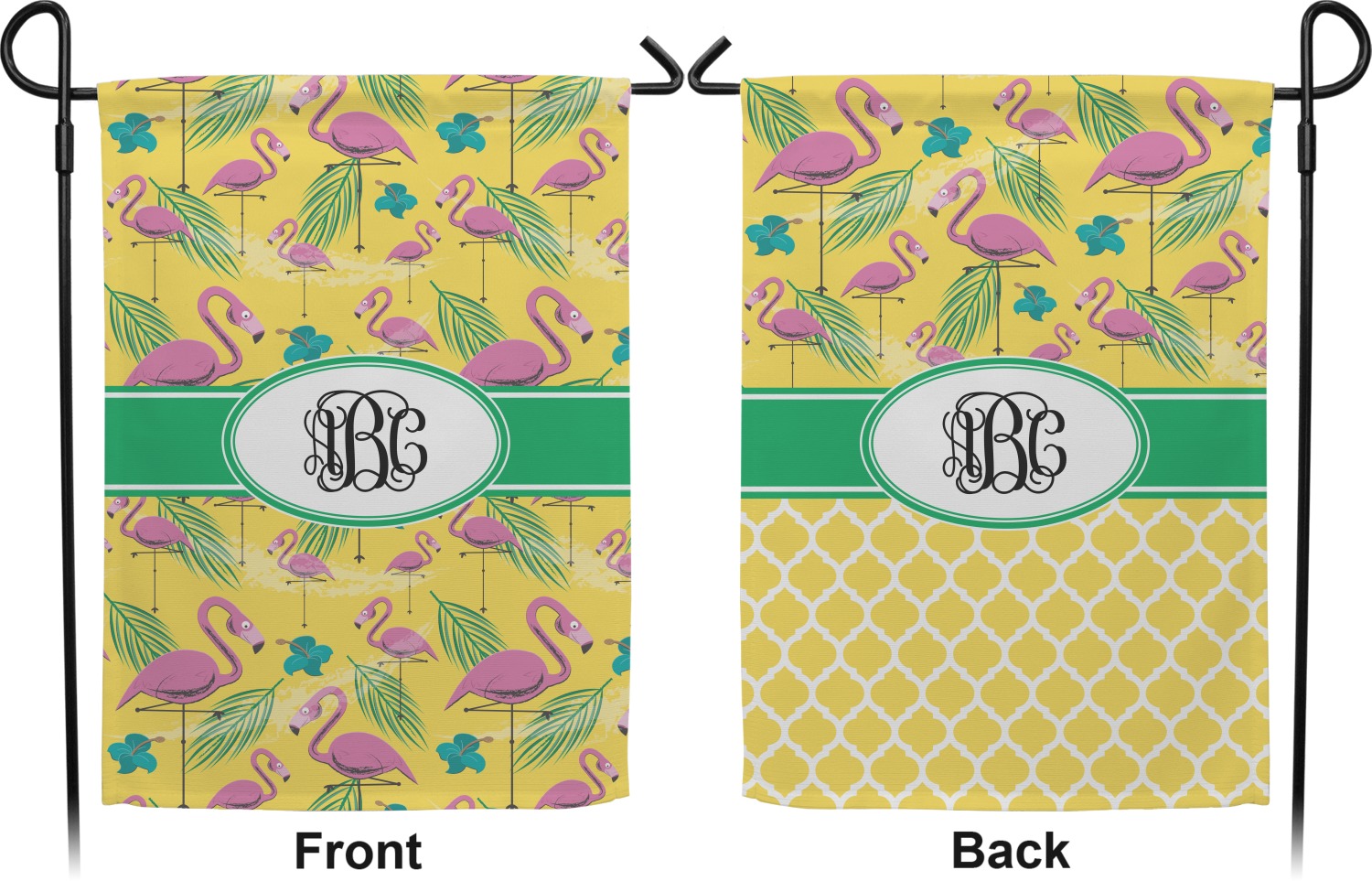 These custom garden flags are made of a durable, double-ply, polyester weave, allowing them to withstand the elements year round. The small flags measure at approximately 12 by 18 inches. The large flags measure out to 28 by 37 inches. You can order these decorative flags with your customization printed on the front only, or the front and back.