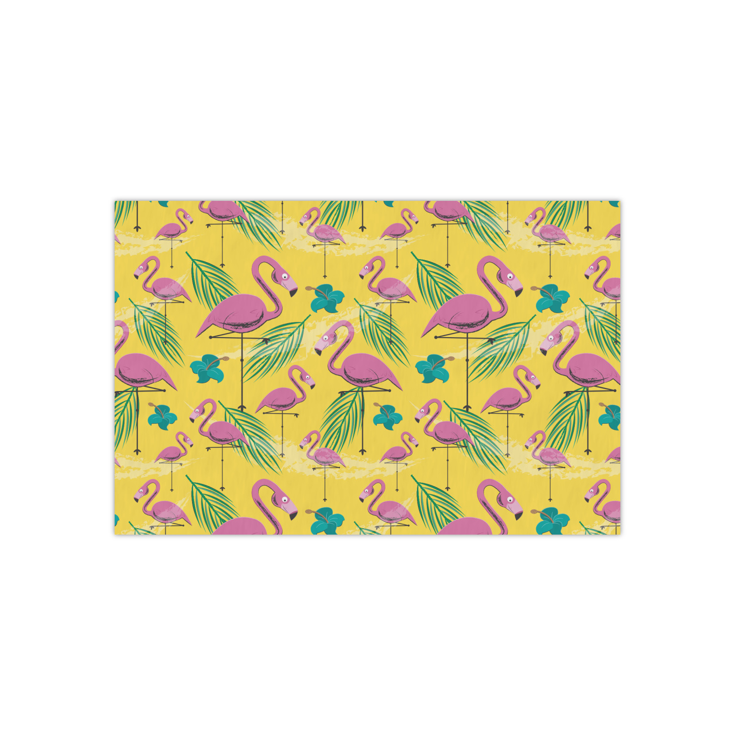 The idyllic tropical vacation includes palm trees, flirty flowers, and flamingos. This design encompasses all these things and more, on a bright yellow background with sand sprawled carefully throughout.