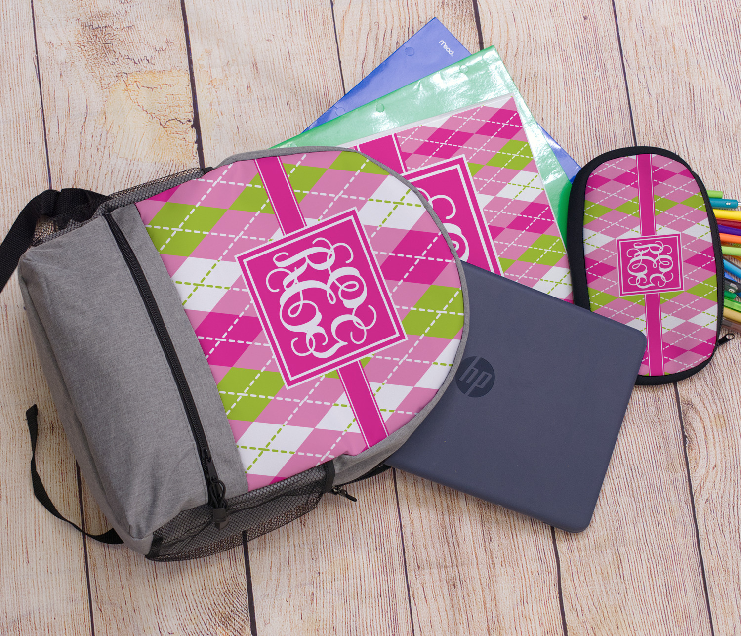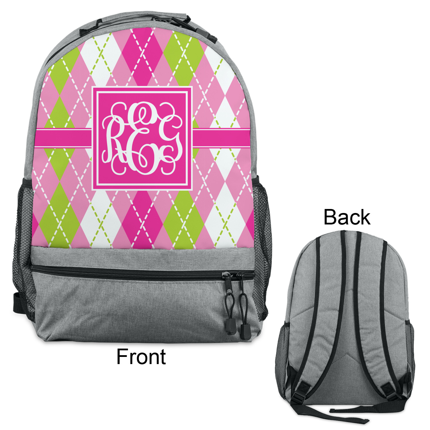 Looking for a preppy, yet still girly girl design? This pink and green argyle print with a square label and an interlocking monogram is as girly as it gets. We have created this argyle pattern in lime green, orchid pink and hot pink. For all of us girly girls and preppies and princesses, this design is a favorite!