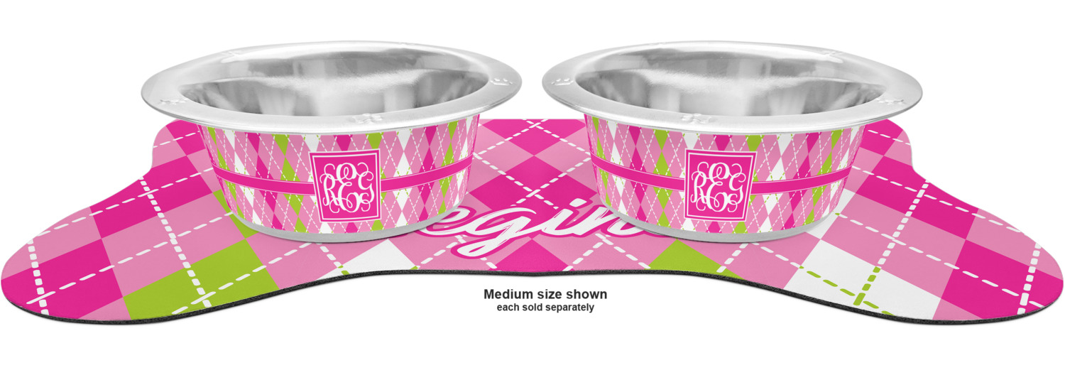 The top of this mat displays your custom design, as it is printed on polyester. To prevent slippage, the underside of the mat is made of rubber. We offer a small dog food mat, suitable for smaller dogs and a large dog food mat for bigger breeds. The small dog food mat is approximately 19 by 13 inches, while the large dog feeding mat measures at approximately 26.75 by 18 inches. Both personalized mats are ideally sized to fit two dog bowls.