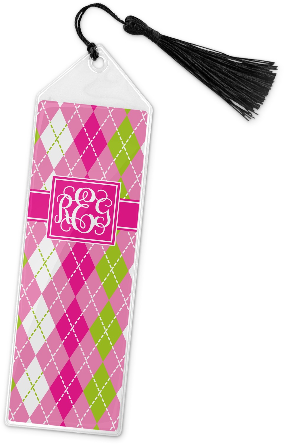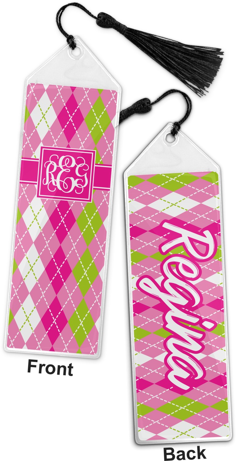 Your personalized bookmark is made of a sturdy, clear vinyl, and is approximately 7.5" x 2.25". We display your personalization on vinyl inserts that are placed on both sides. Accompanying each book marker is a black, fringe tassel that attaches to the reinforced, triangular header.