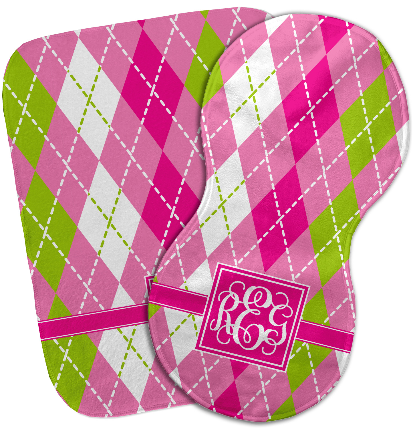 Looking for a preppy, yet still girly girl design? This pink and green argyle print with a square label and an interlocking monogram is as girly as it gets. We have created this argyle pattern in lime green, orchid pink and hot pink. For all of us girly girls and preppies and princesses, this design is a favorite!