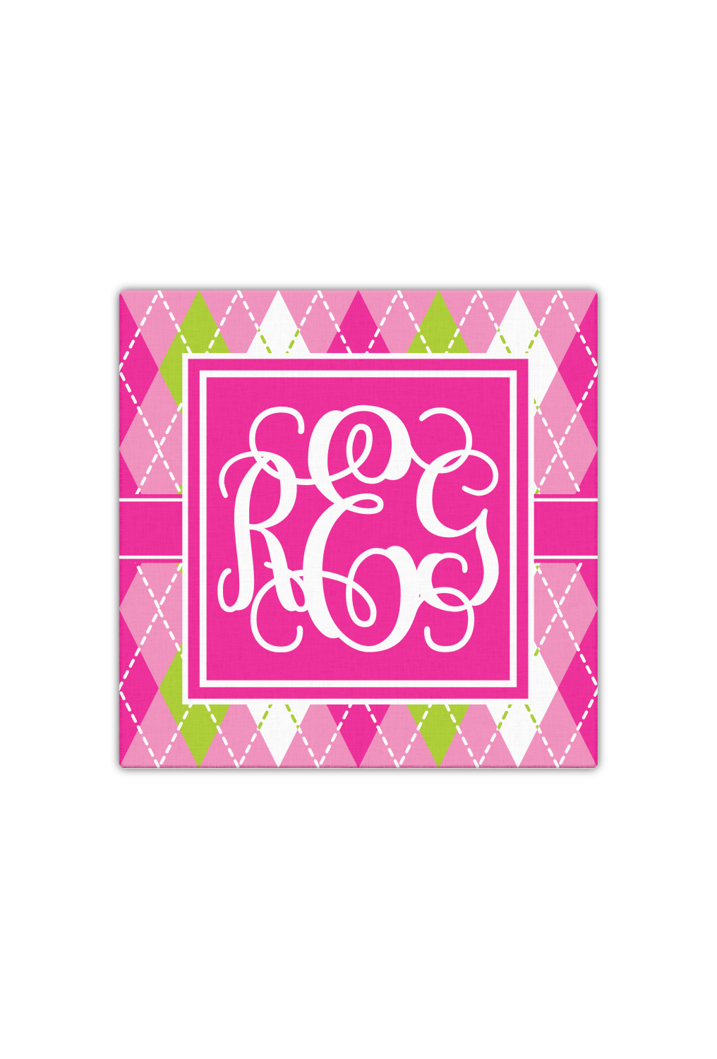 Looking for a preppy, yet still girly girl design? This pink and green argyle print with a square label and an interlocking monogram is as girly as it gets. We have created this argyle pattern in lime green, orchid pink and hot pink. For all of us girly girls and preppies and princesses, this design is a favorite!
