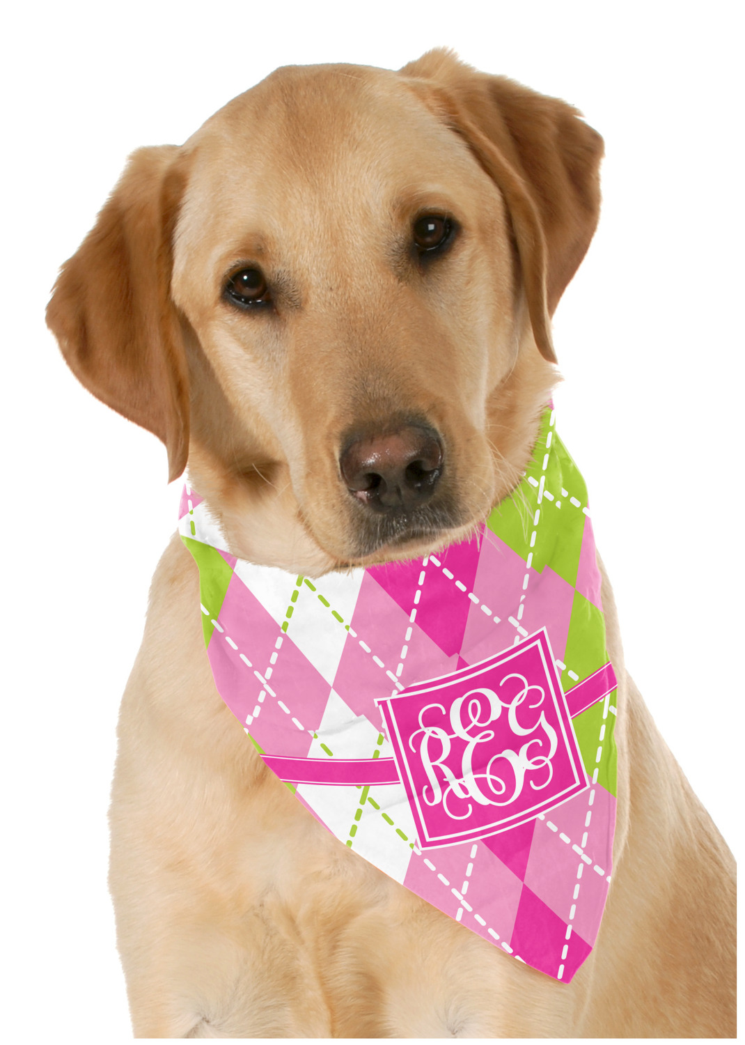 This beautiful pet bandana really is the perfect accessory. It is made from a silky feeling polyester and measures at approximately 23" x 23". Your personalization will be printed on a diagonal, so that you are able to read the personalization when folded into a triangle. This bandana fits best on large dogs, but can be folded smaller if there is no personalized text to fit smaller pets.