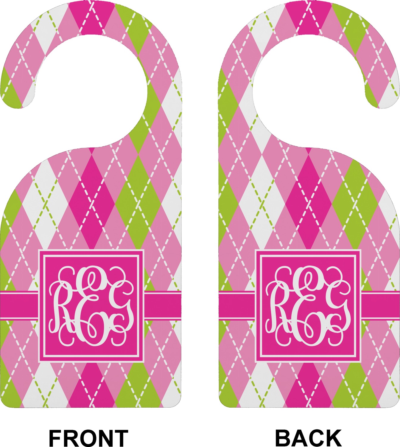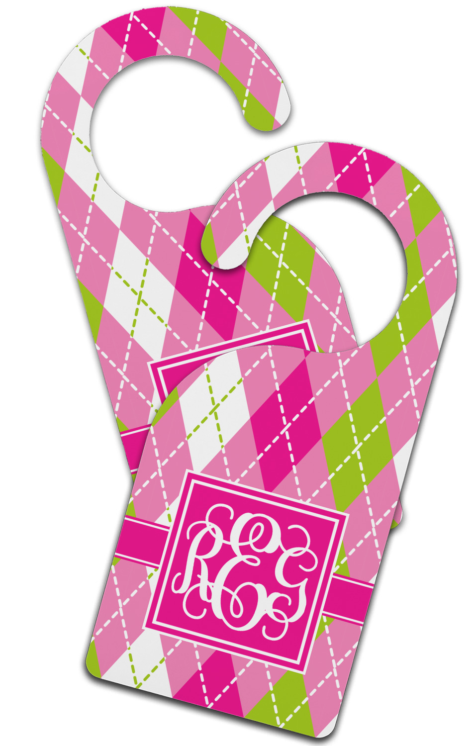 Looking for a preppy, yet still girly girl design? This pink and green argyle print with a square label and an interlocking monogram is as girly as it gets. We have created this argyle pattern in lime green, orchid pink and hot pink. For all of us girly girls and preppies and princesses, this design is a favorite!