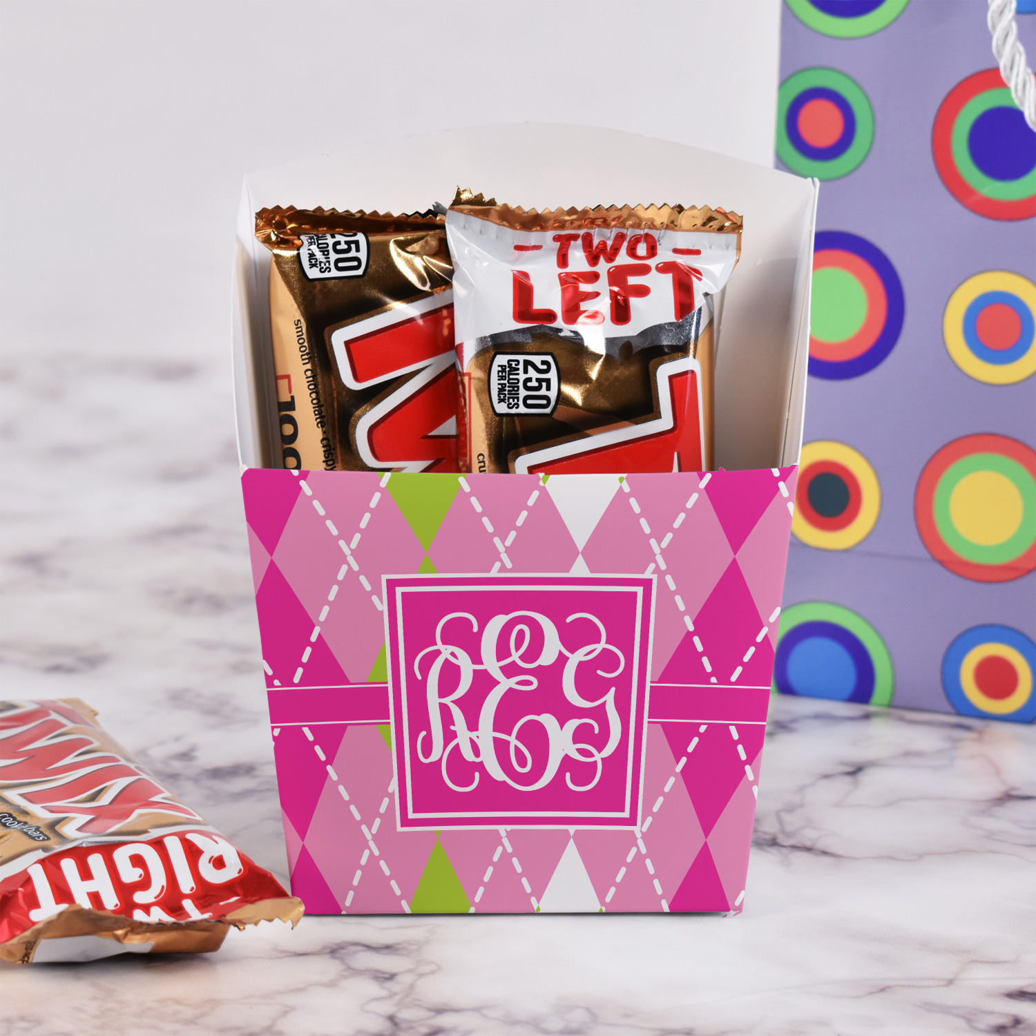 Looking for a preppy, yet still girly girl design? This pink and green argyle print with a square label and an interlocking monogram is as girly as it gets. We have created this argyle pattern in lime green, orchid pink and hot pink. For all of us girly girls and preppies and princesses, this design is a favorite!