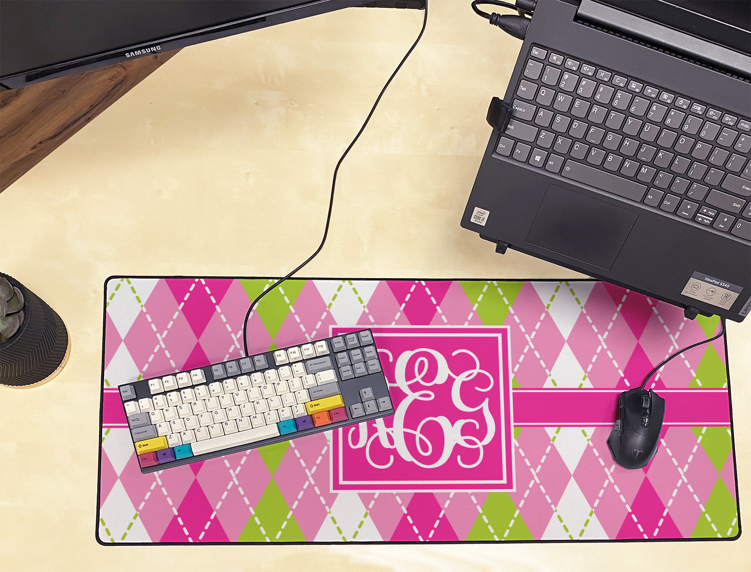 Looking for a preppy, yet still girly girl design? This pink and green argyle print with a square label and an interlocking monogram is as girly as it gets. We have created this argyle pattern in lime green, orchid pink and hot pink. For all of us girly girls and preppies and princesses, this design is a favorite!
