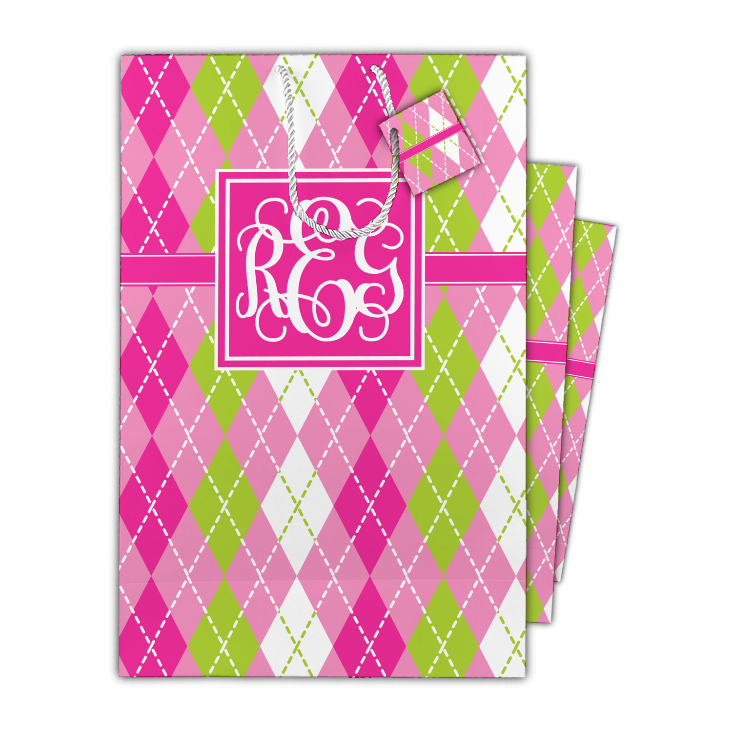 Looking for a preppy, yet still girly girl design? This pink and green argyle print with a square label and an interlocking monogram is as girly as it gets. We have created this argyle pattern in lime green, orchid pink and hot pink. For all of us girly girls and preppies and princesses, this design is a favorite!