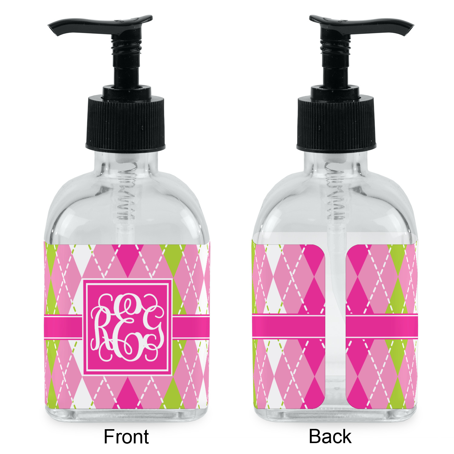 Crafted from a high-quality glass, these soap dispensers and lotion dispensers are durable and robust, while still looking elegant. They are sold with black pumps. Each soap dispenser pump measures at 6.5 by 2.25 inches. On these soap pumps, we display your customized design on a personalized vinyl adhesive on three sides. That way, you can judge how much liquid is in the bottles from the back.