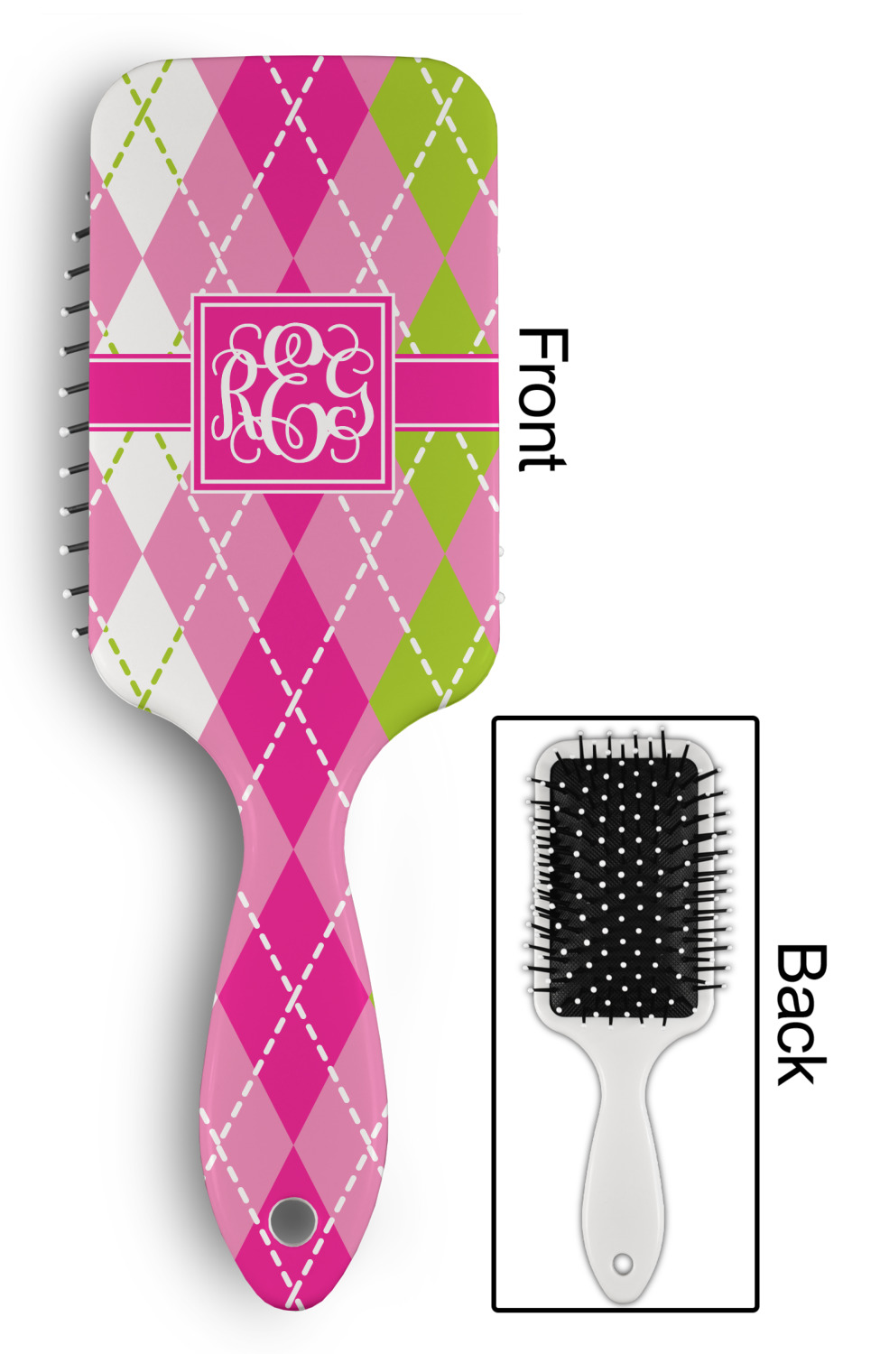 Your designed is printed on the front of the brush.; The back handle and sides are white.