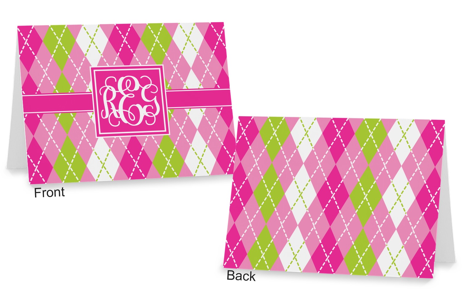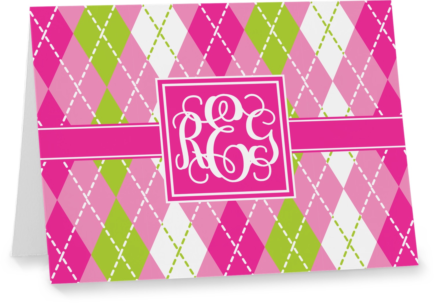 Looking for a preppy, yet still girly girl design? This pink and green argyle print with a square label and an interlocking monogram is as girly as it gets. We have created this argyle pattern in lime green, orchid pink and hot pink. For all of us girly girls and preppies and princesses, this design is a favorite!