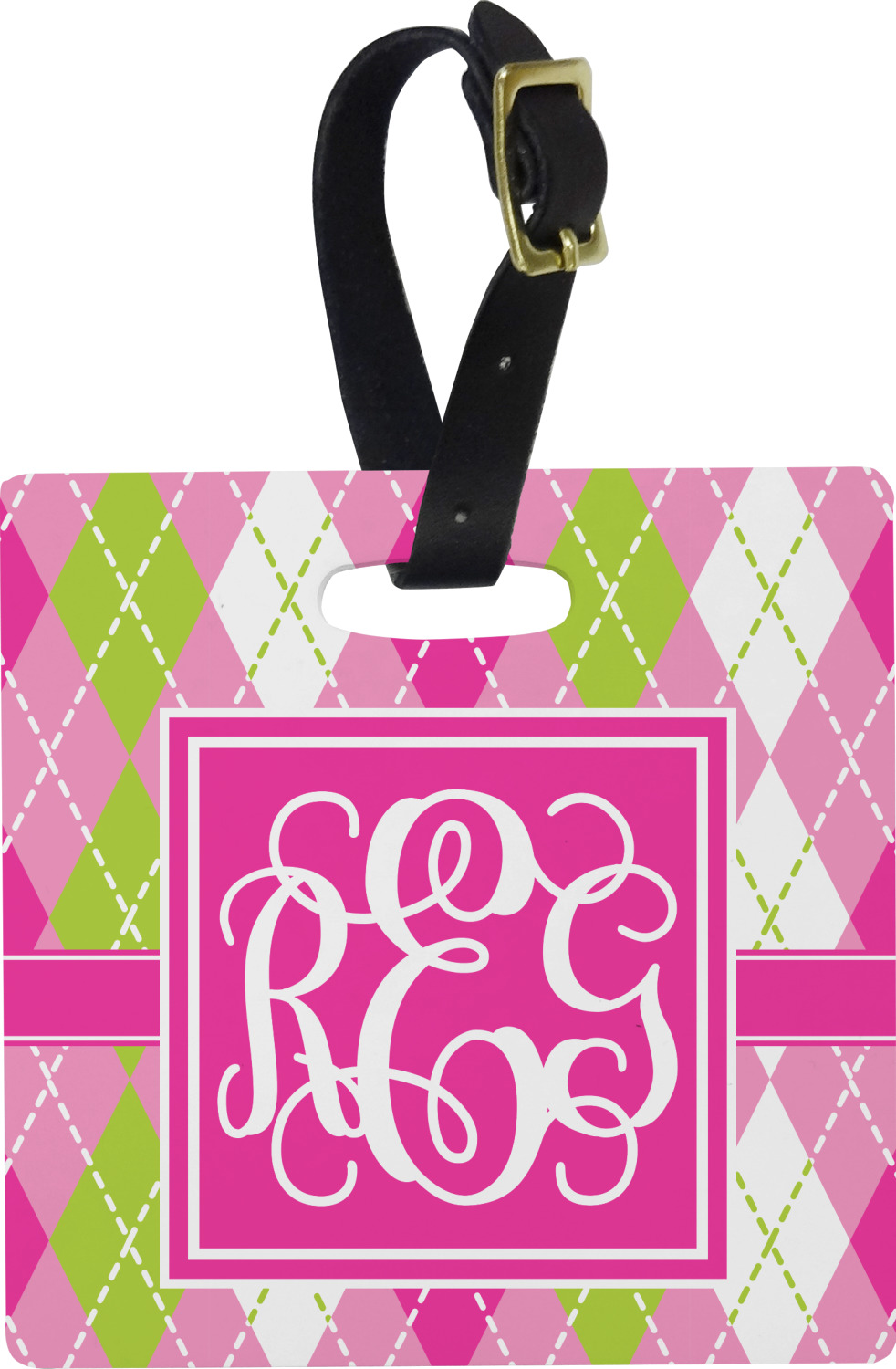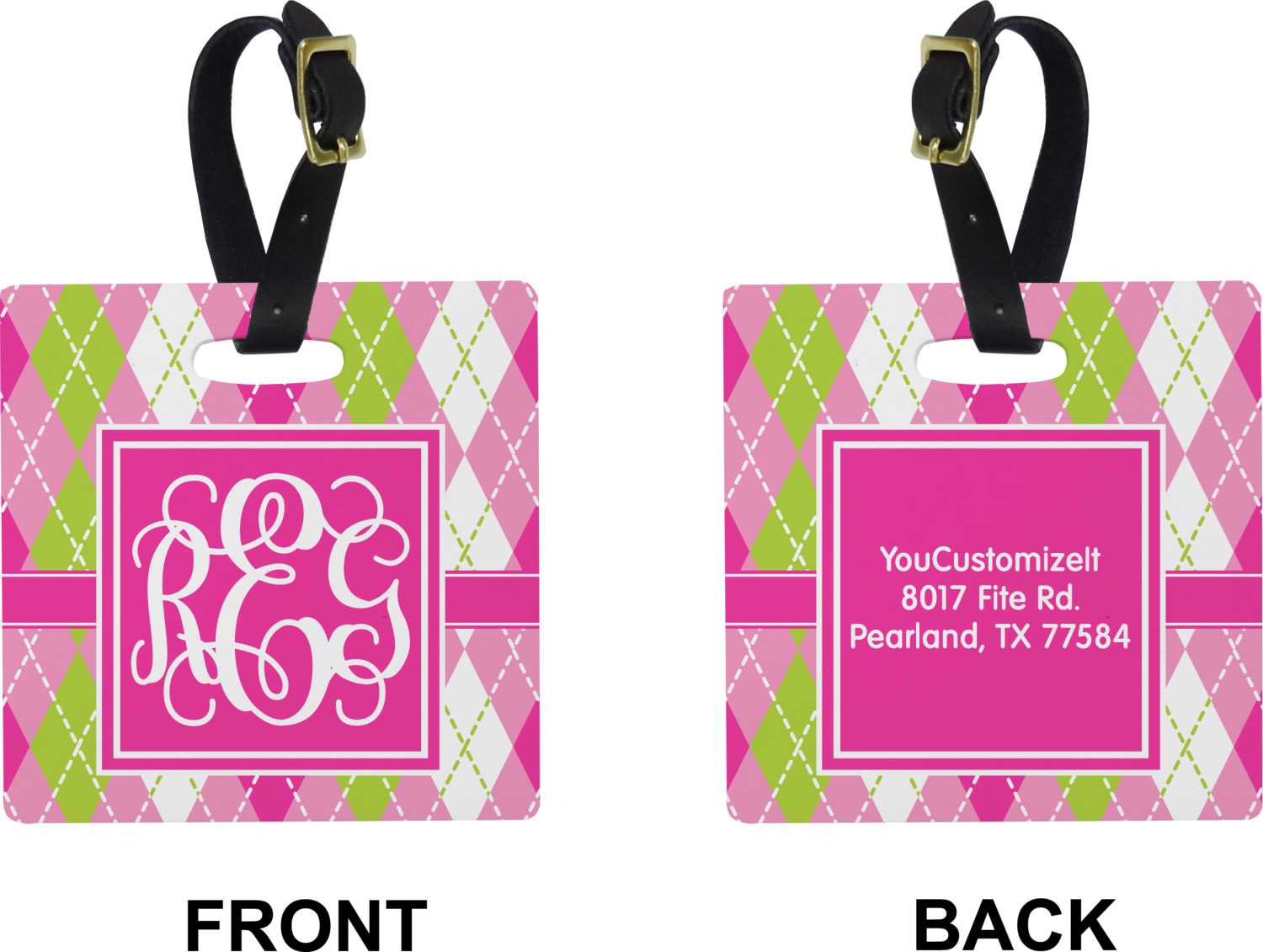 These personalized bag tags are sold in a variety of shapes, so that you may find the product that meets your vision exactly. We sell a round luggage tag, which measures at approximately 4" x 4". Our square luggage tag is about 3.5" x 3.5", while our rectangular version is 2.75" x 4 ".