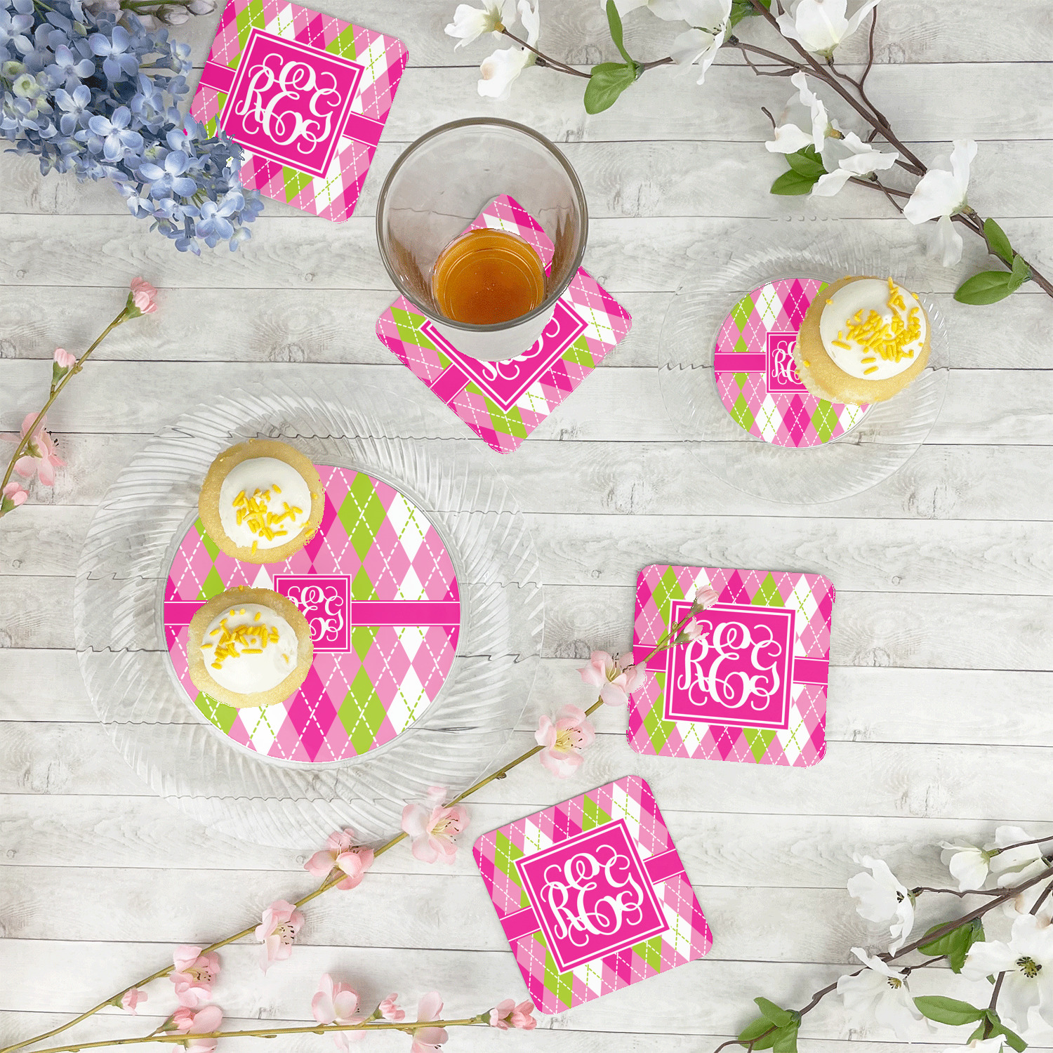 Looking for a preppy, yet still girly girl design? This pink and green argyle print with a square label and an interlocking monogram is as girly as it gets. We have created this argyle pattern in lime green, orchid pink and hot pink. For all of us girly girls and preppies and princesses, this design is a favorite!