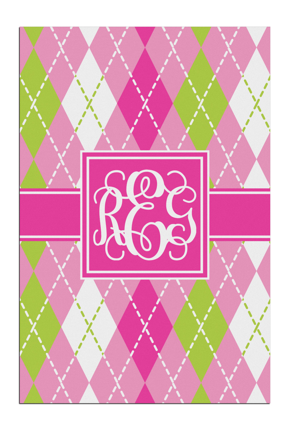 Looking for a preppy, yet still girly girl design? This pink and green argyle print with a square label and an interlocking monogram is as girly as it gets. We have created this argyle pattern in lime green, orchid pink and hot pink. For all of us girly girls and preppies and princesses, this design is a favorite!