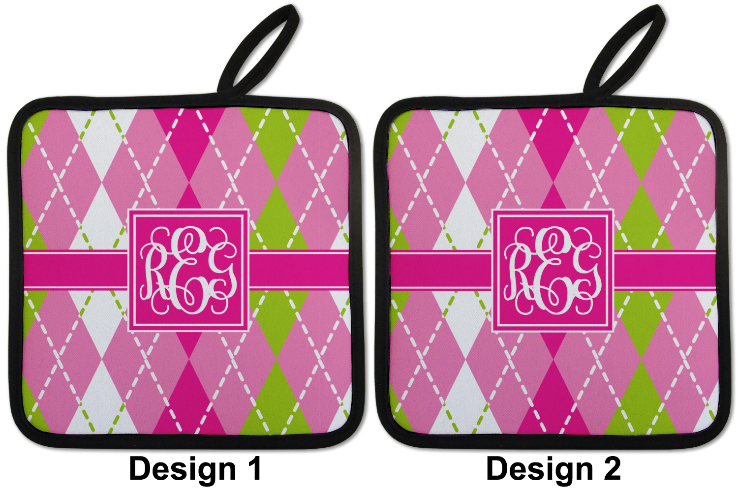 Our personalized pot holders feature a neoprene front that displays your personalization in vibrant colors. The backing of the hot pot holder is rubberized; the textured backing allows you to have a great grip when using this custom pot holder. The two materials are joined with a sleek, black trim, and the holder also includes an attached loop for hanging and storage. The pot holder is approximately 8.75 inches by 8.75 inches and 0.25 inches tall, while the fabric loop is 2.5 inches long. You can purchase a kitchen pot holder by itself or as a set of 2. We also offer a set including one pot holder and one oven mitt.
