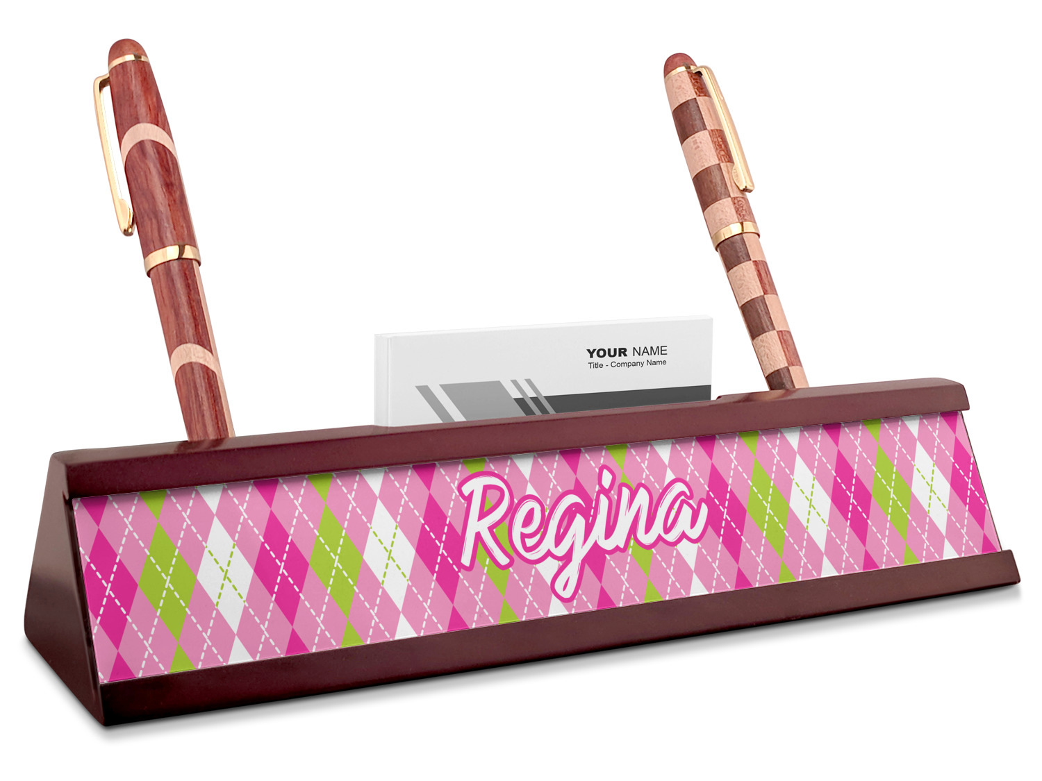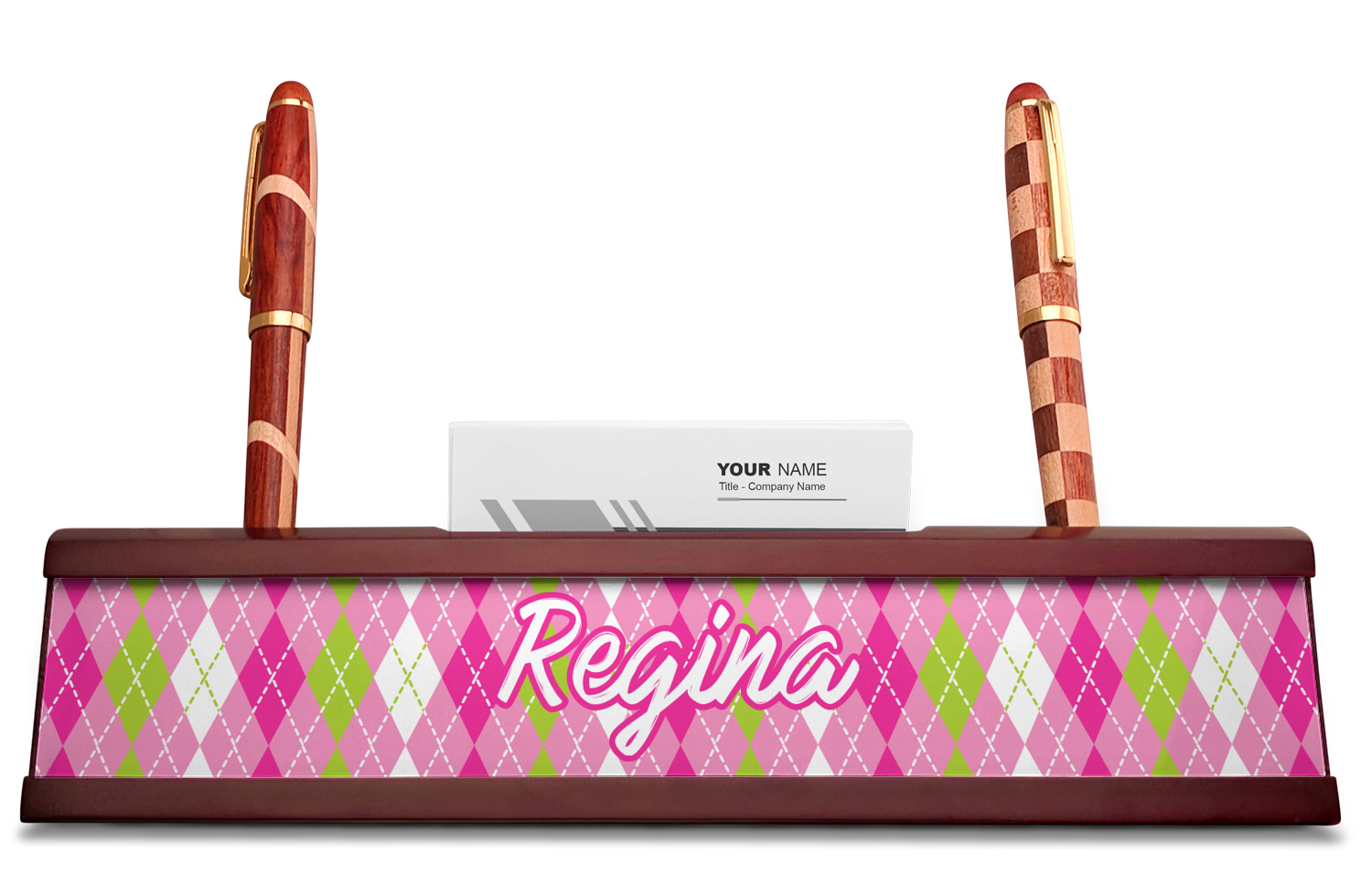 Your desk name plates are crafted from a high-quality, dark-cherry mahogany. At approximately 9.5 by 1.875 by 2.5 inches, this name plaque will fit perfectly, front and center, on your desk. Your customization spans across the entire face of the nameplate. Behind the nameplate lies a skinny slot that can fit approximately 15, traditionally-sized, business cards. You can also store your writing utensils on either side of this custom desk name plate.