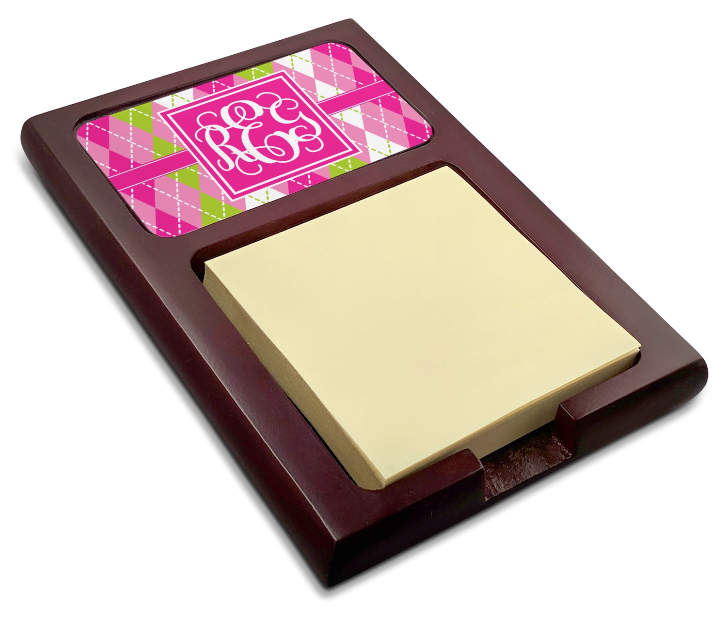Crafted from a fine mahogany, this post it note holder is in the shade of a dark, cherry color. The dispenser itself is about 4.25 by 6.25 by 0.75 inches. You can place your 3 by 3 inch sticky notes in the indentation below the nameplate. We print your customization onto the nameplate that rests above the velvety indentation.