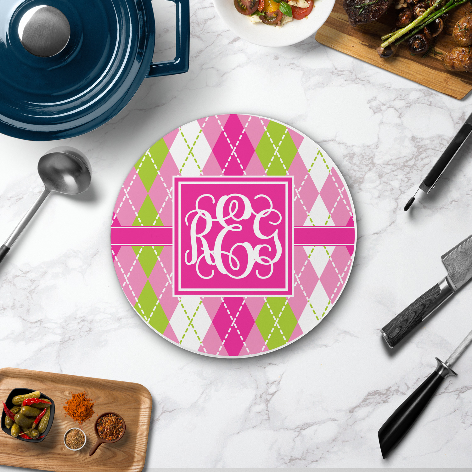 The round trivets can be customized with your own design, your own photo, or your own logo. You can add personalization, like a monogram, family name or initial to your uploaded design / art. You can also customize one of our designs and change the patterns, colors, personalization, fonts etc.