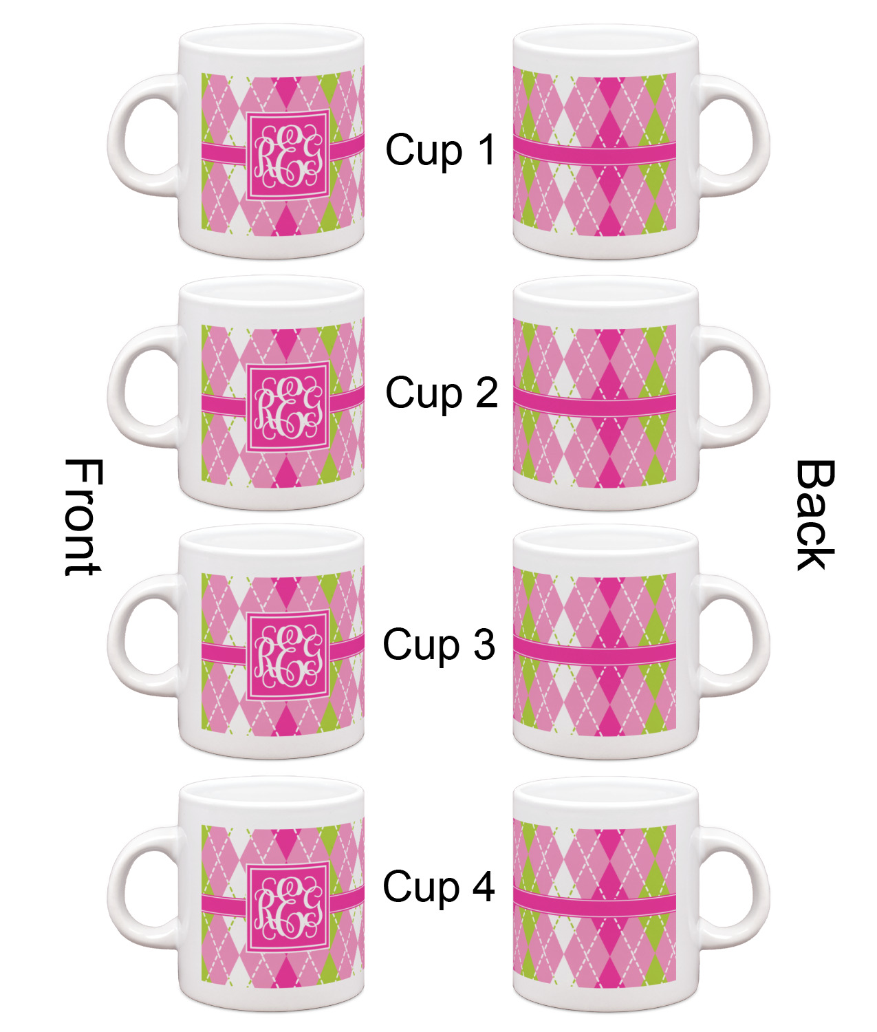 Each of our espresso mugs is a ceramic material sure to keep your drink warm. Personalize one cup for yourself, or order a set of 4! Its the perfect little gift for any coffee lover! We carry two sizes for you to personalize - 3 oz. (approx. 3.25" x 2.325" x 2.625") or 6 oz. (approx. 4" x 2.9" x 2.9"). Our 3 oz. mug is perfect for that single shot espresso while our 6 oz. mug can be your next favorite cappuccino cup holding two shots of espresso!