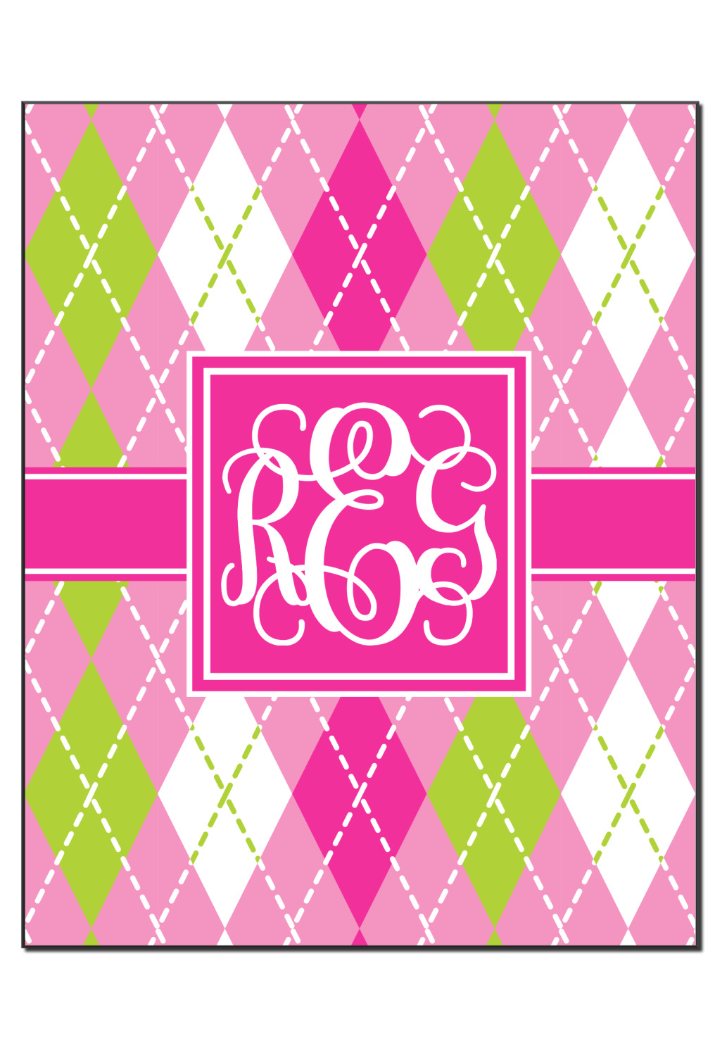 Looking for a preppy, yet still girly girl design? This pink and green argyle print with a square label and an interlocking monogram is as girly as it gets. We have created this argyle pattern in lime green, orchid pink and hot pink. For all of us girly girls and preppies and princesses, this design is a favorite!