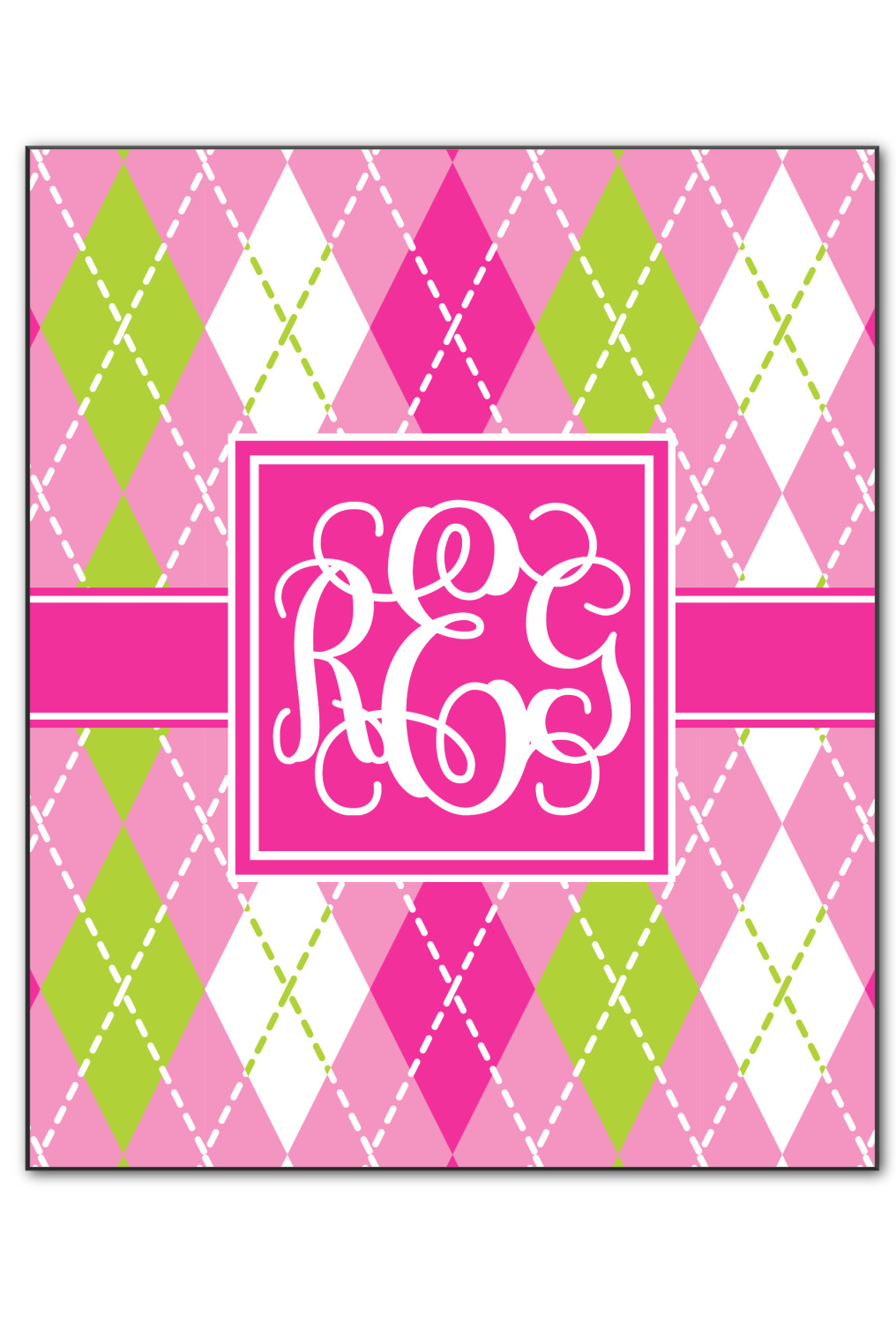 Looking for a preppy, yet still girly girl design? This pink and green argyle print with a square label and an interlocking monogram is as girly as it gets. We have created this argyle pattern in lime green, orchid pink and hot pink. For all of us girly girls and preppies and princesses, this design is a favorite!