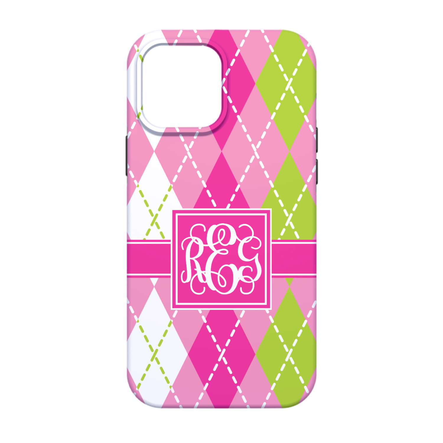 Looking for a preppy, yet still girly girl design? This pink and green argyle print with a square label and an interlocking monogram is as girly as it gets. We have created this argyle pattern in lime green, orchid pink and hot pink. For all of us girly girls and preppies and princesses, this design is a favorite!