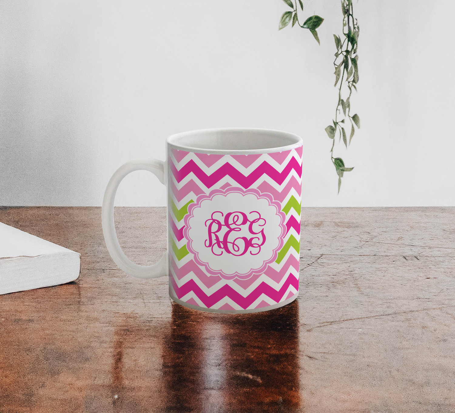 Looking for a girly girl design. This pink and green chevron print with a scalloped label and an interlocking monogram is as girly as it gets. We have created this chevron pattern in lime green, orchid pink and hot pink. For all of us girly girls and princesses, this is our design choice!