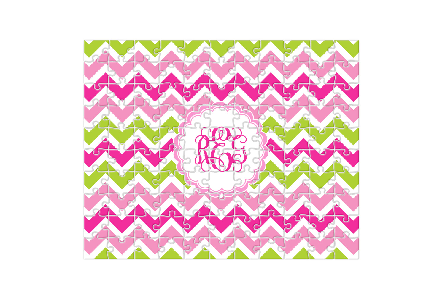Looking for a girly girl design. This pink and green chevron print with a scalloped label and an interlocking monogram is as girly as it gets. We have created this chevron pattern in lime green, orchid pink and hot pink. For all of us girly girls and princesses, this is our design choice!