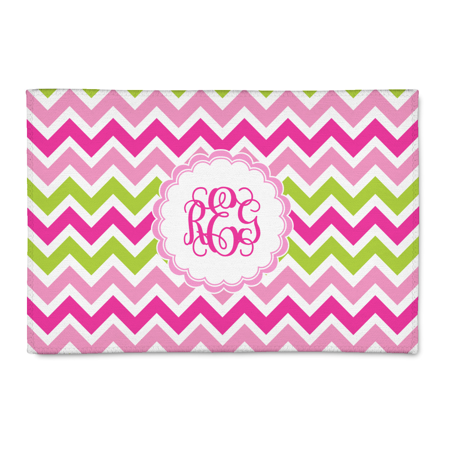 Looking for a girly girl design. This pink and green chevron print with a scalloped label and an interlocking monogram is as girly as it gets. We have created this chevron pattern in lime green, orchid pink and hot pink. For all of us girly girls and princesses, this is our design choice!