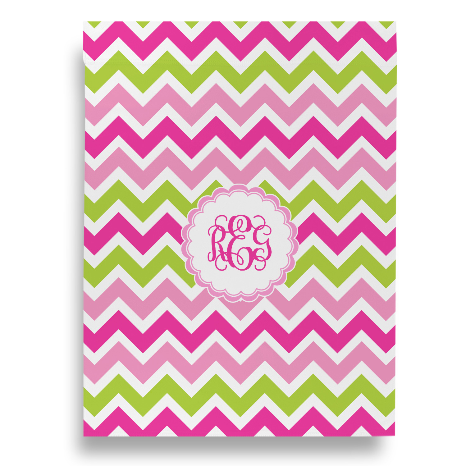 Looking for a girly girl design. This pink and green chevron print with a scalloped label and an interlocking monogram is as girly as it gets. We have created this chevron pattern in lime green, orchid pink and hot pink. For all of us girly girls and princesses, this is our design choice!
