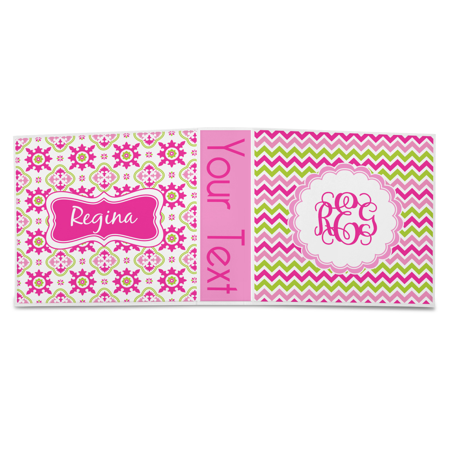 Looking for a girly girl design. This pink and green chevron print with a scalloped label and an interlocking monogram is as girly as it gets. We have created this chevron pattern in lime green, orchid pink and hot pink. For all of us girly girls and princesses, this is our design choice!