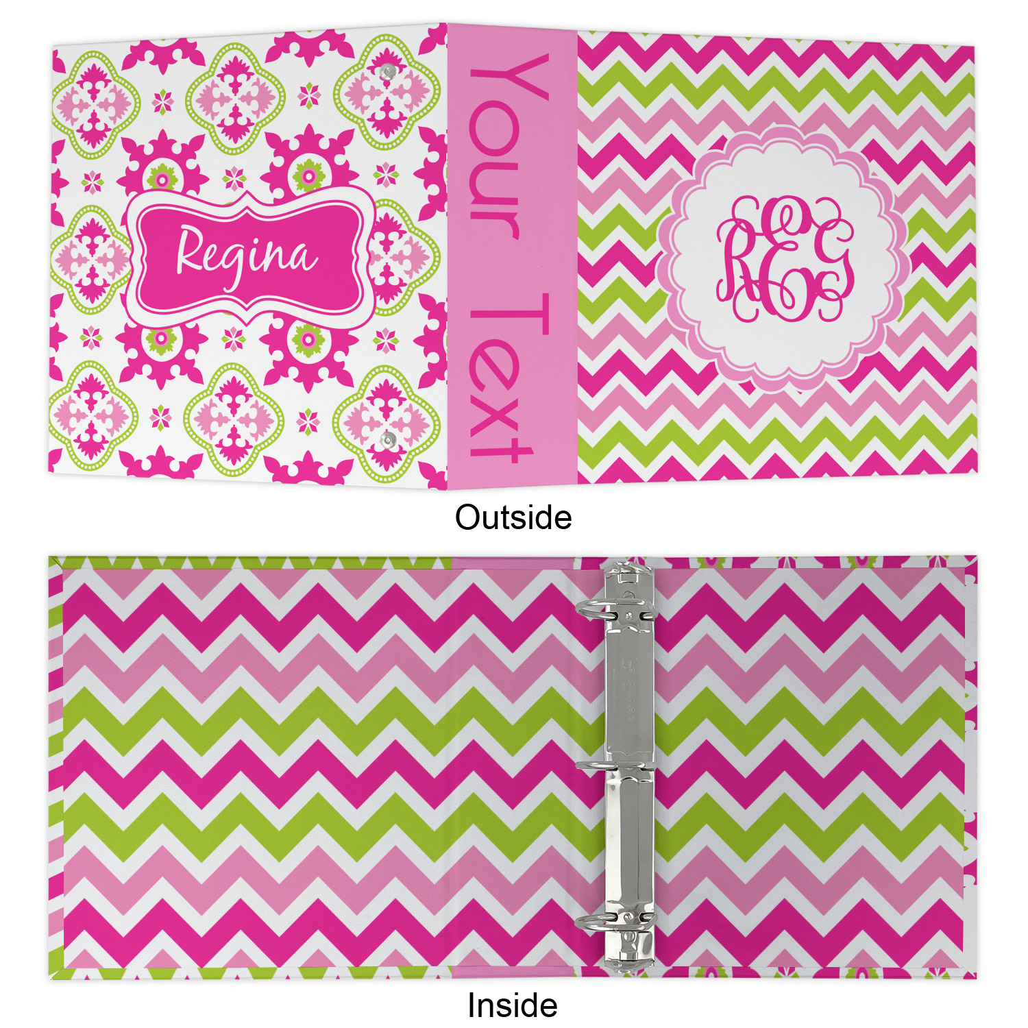 The outside is printed in 3 sections - front cover, spine and back cover - while the inside is printed in a full single print of your choice. The inside boasts a high quality nickel plated binder mechanism with a trigger opening function and is secured to the cardboard binder with posts and screws.