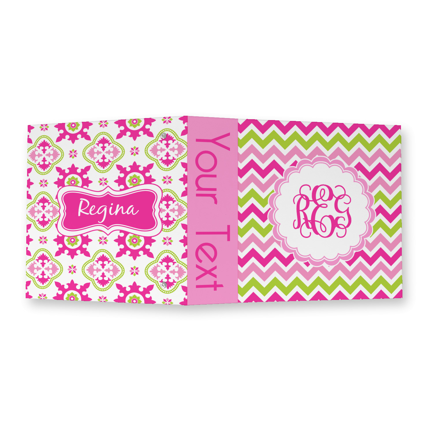 Made from a sturdy cardboard base with a full high quality canvas textured vinyl wrap with the design of your choice. Unlike our standard 3-ring binder with the full wrap design your artwork wraps from the front and back and into the inside of the binder.