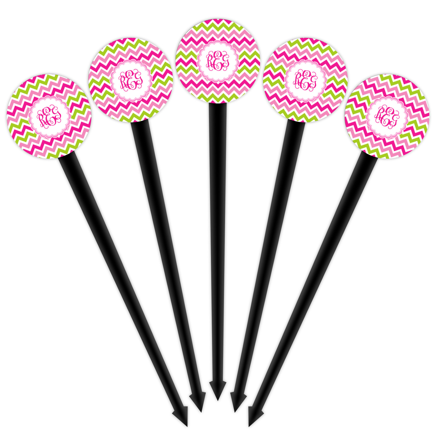 Our plastic cocktail picks have a round disc on top that is printed in full color with your event theme, colors, your logo, your photo, names, initials, monograms etc.