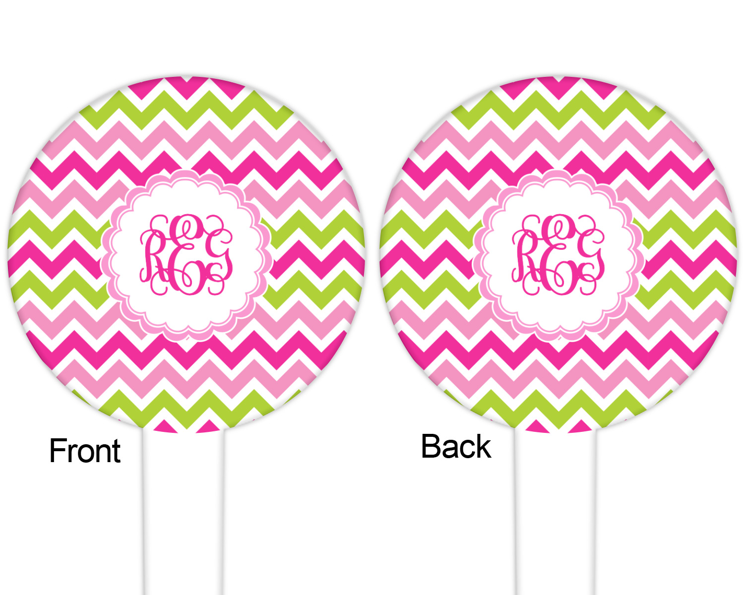 Looking for a girly girl design. This pink and green chevron print with a scalloped label and an interlocking monogram is as girly as it gets. We have created this chevron pattern in lime green, orchid pink and hot pink. For all of us girly girls and princesses, this is our design choice!