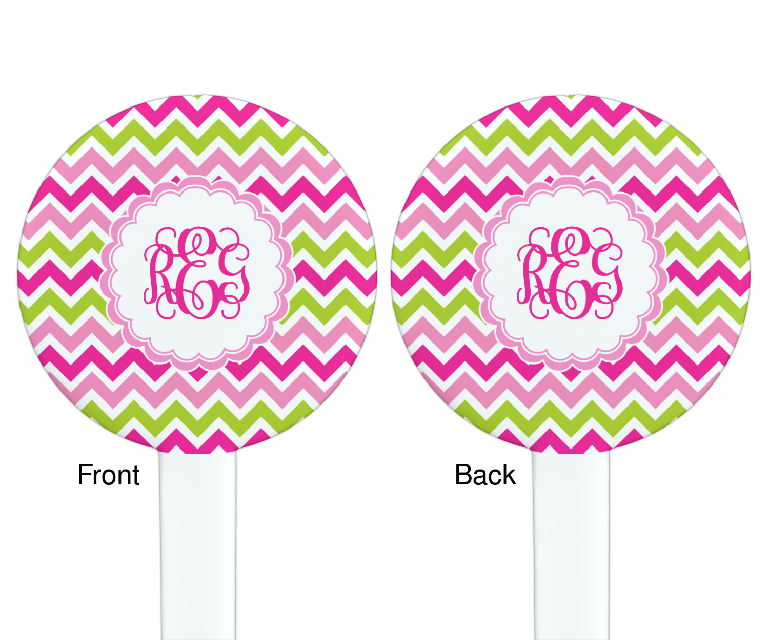 Looking for a girly girl design. This pink and green chevron print with a scalloped label and an interlocking monogram is as girly as it gets. We have created this chevron pattern in lime green, orchid pink and hot pink. For all of us girly girls and princesses, this is our design choice!