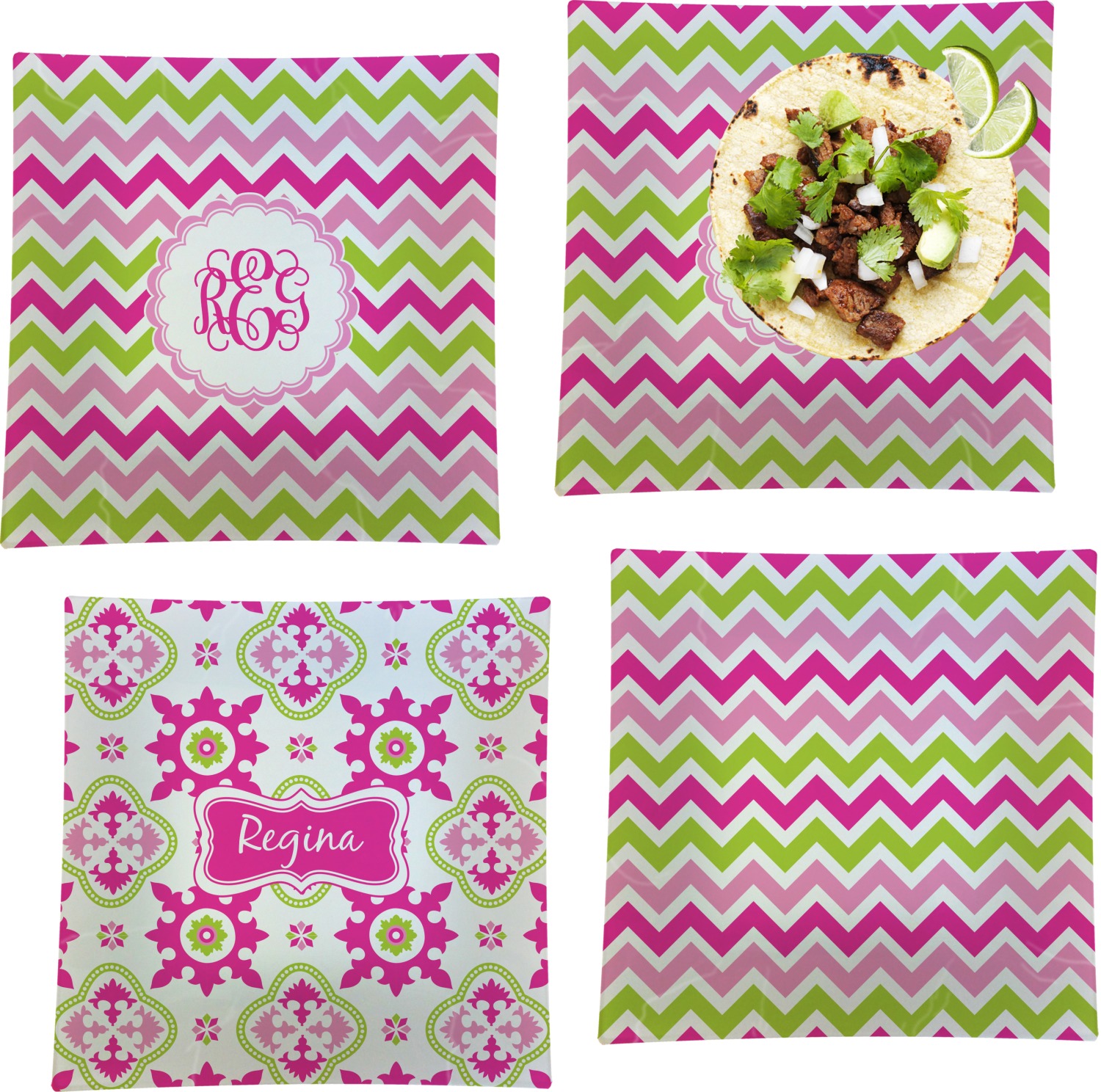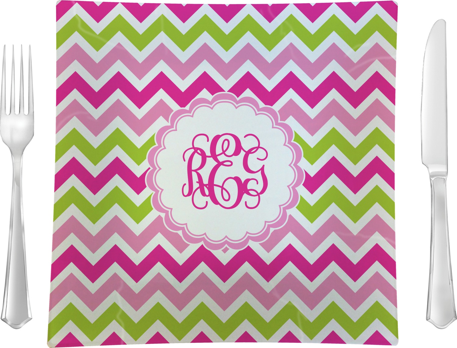 Looking for a girly girl design. This pink and green chevron print with a scalloped label and an interlocking monogram is as girly as it gets. We have created this chevron pattern in lime green, orchid pink and hot pink. For all of us girly girls and princesses, this is our design choice!