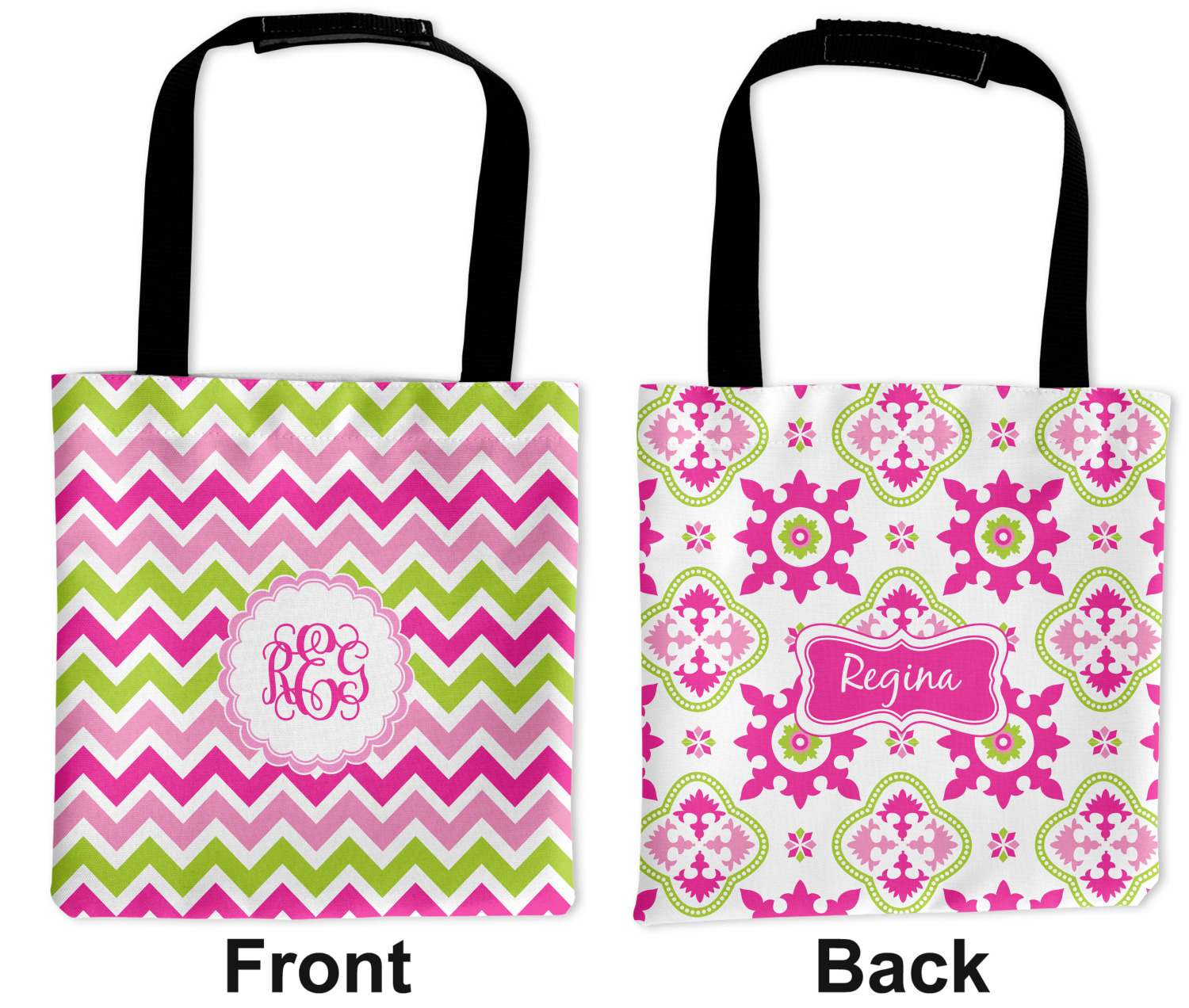 Looking for a girly girl design. This pink and green chevron print with a scalloped label and an interlocking monogram is as girly as it gets. We have created this chevron pattern in lime green, orchid pink and hot pink. For all of us girly girls and princesses, this is our design choice!
