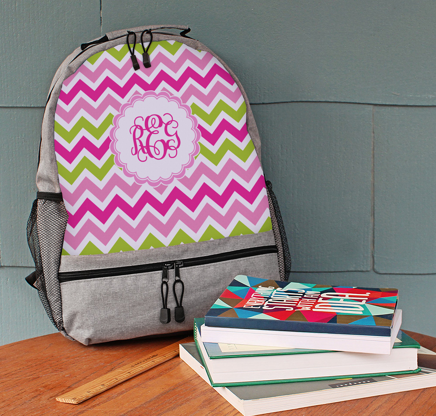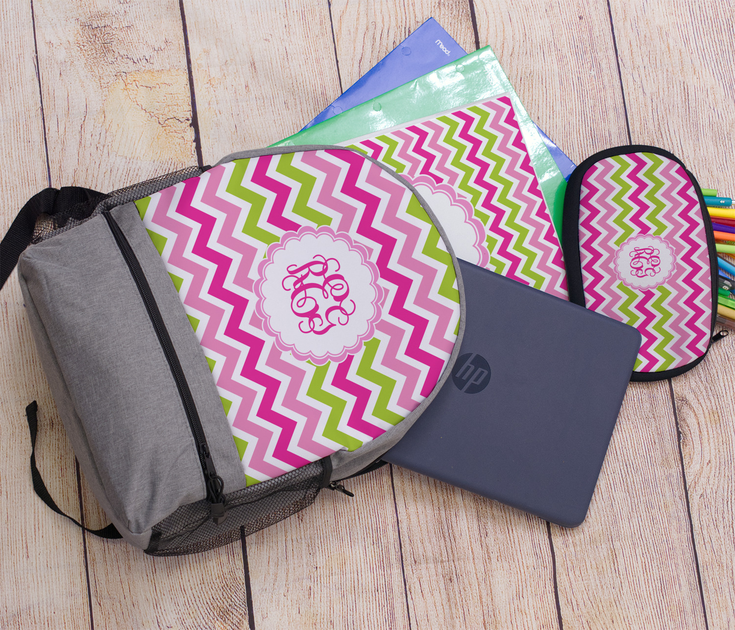 Looking for a girly girl design. This pink and green chevron print with a scalloped label and an interlocking monogram is as girly as it gets. We have created this chevron pattern in lime green, orchid pink and hot pink. For all of us girly girls and princesses, this is our design choice!