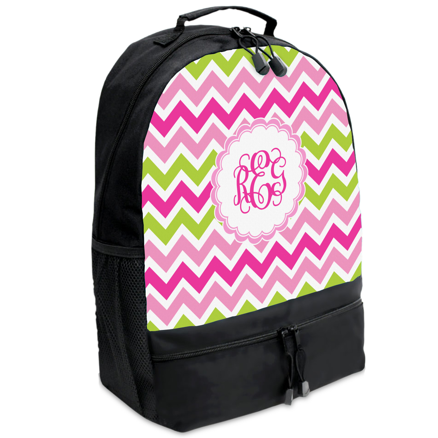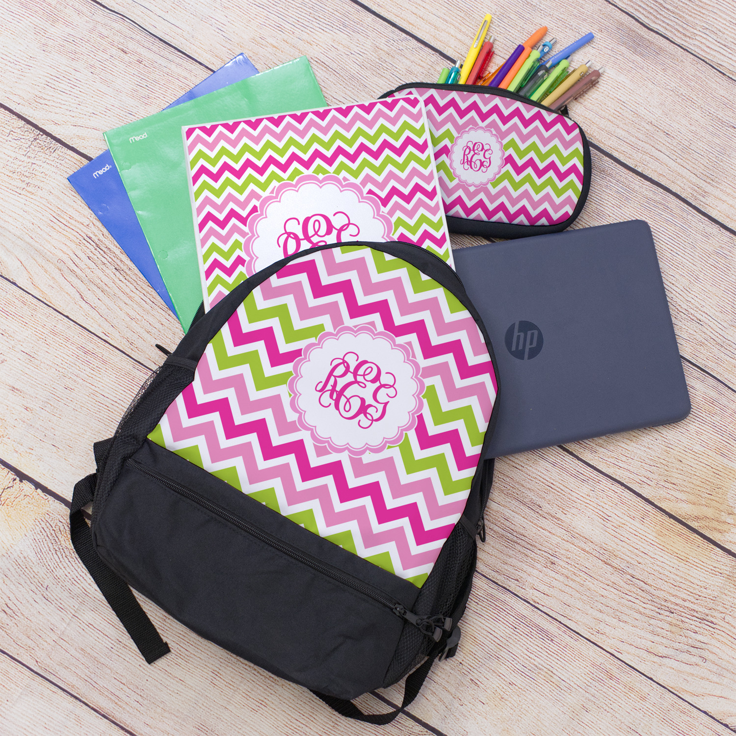 Looking for a girly girl design. This pink and green chevron print with a scalloped label and an interlocking monogram is as girly as it gets. We have created this chevron pattern in lime green, orchid pink and hot pink. For all of us girly girls and princesses, this is our design choice!